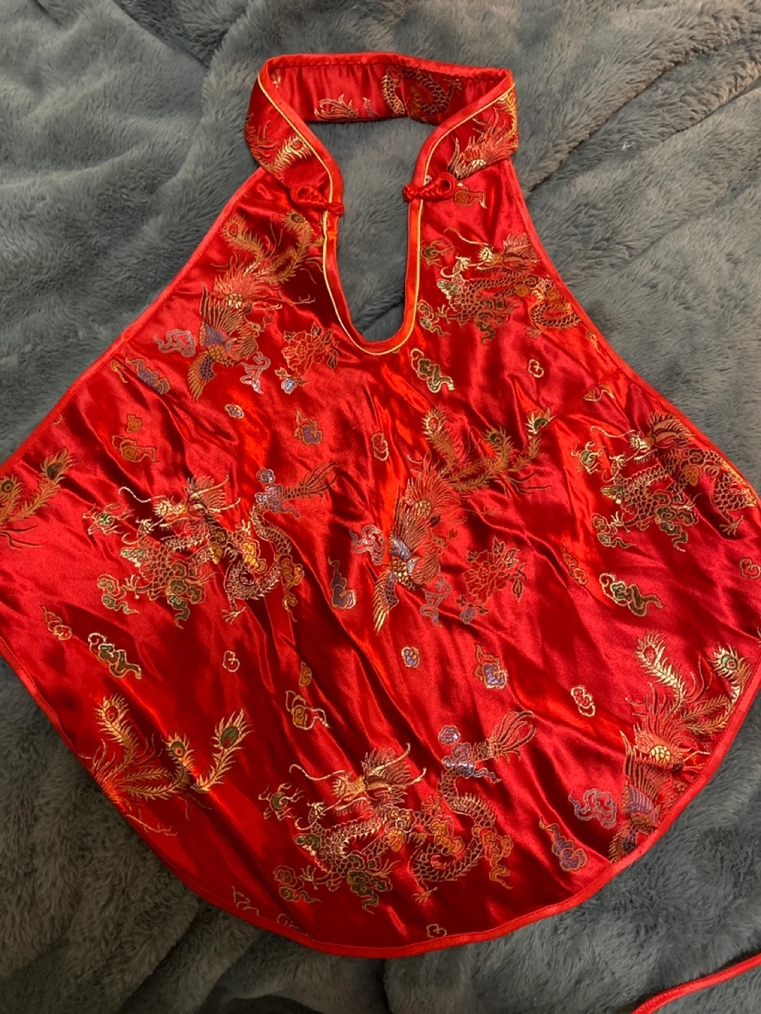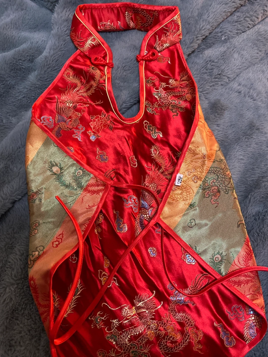 This vibrant red top features a beautiful dragon print. It's made from a silky material, with gold trim. The multi-coloured striped back adds a unique touch.