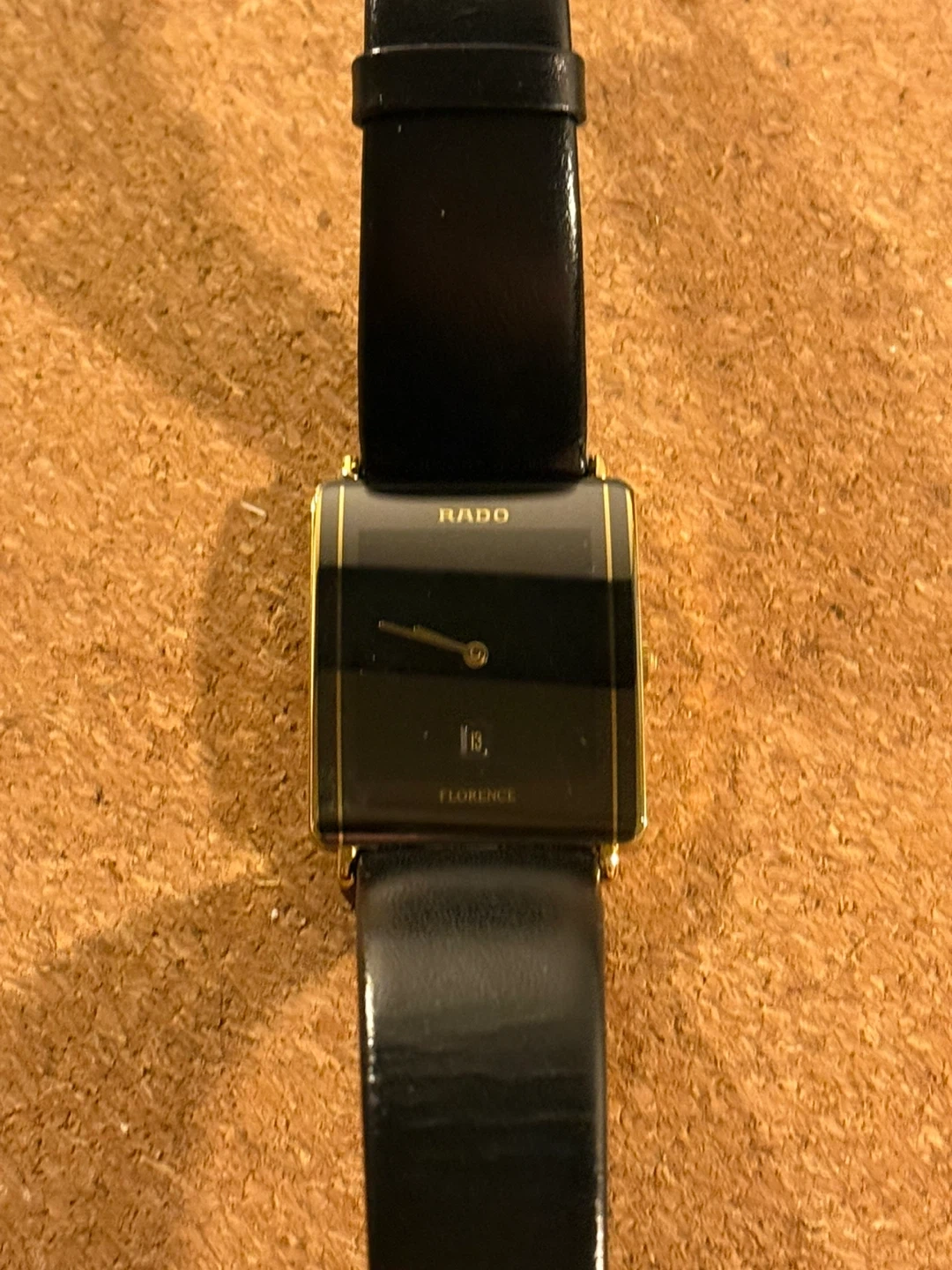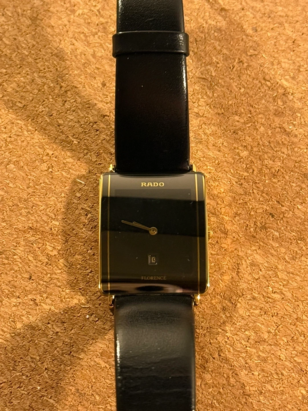 Selling a beautiful Rado Florence watch. It features a sleek black face with gold accents and a black leather strap. The back casing indicates it's watersealed and has a sapphire crystal. A timeless piece!