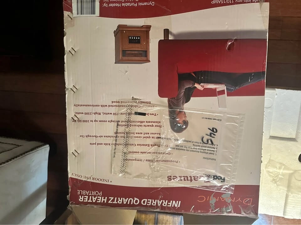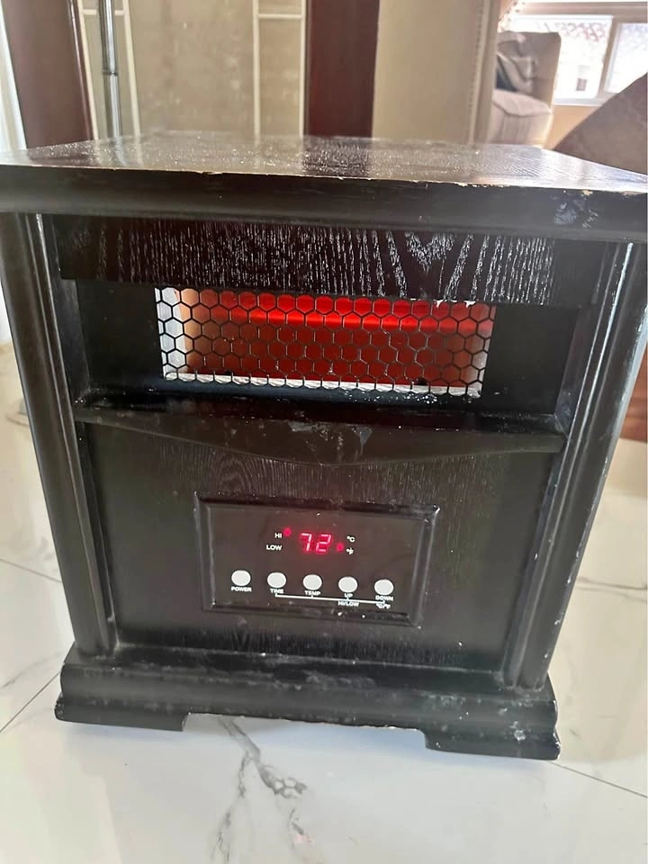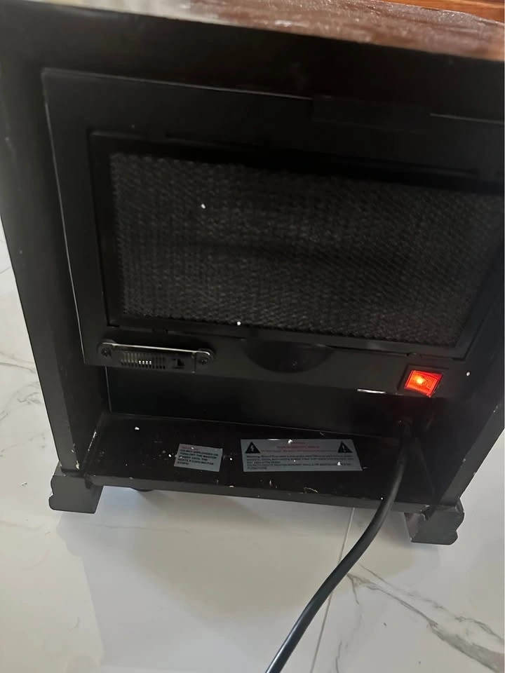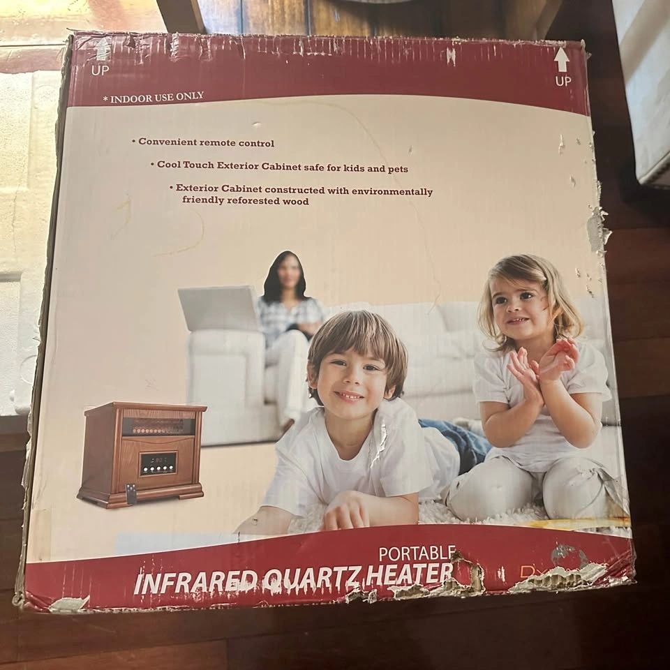 Programmable time and temperature. Good enough to maintain the temperature of a large room. Cool touch exterior cabinet with environmentally friendly reforested wood, safe for kids and pets. Two heat settings: Low (750 watts), High (1500 Watts). Missing remote. Good working condition but has wear and tear marks on the cabinet.