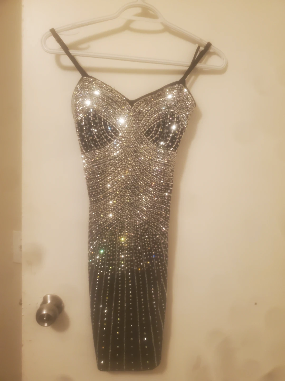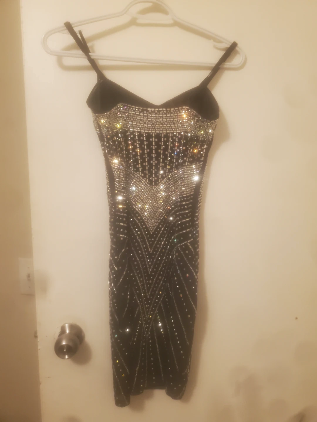 This striking mini dress is covered in shimmering rhinestones. It features a fitted silhouette with adjustable spaghetti straps. Perfect for a night out or special occasion!