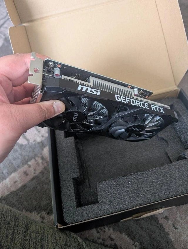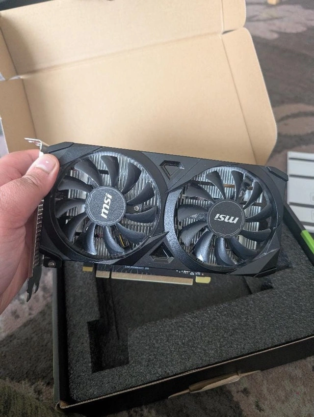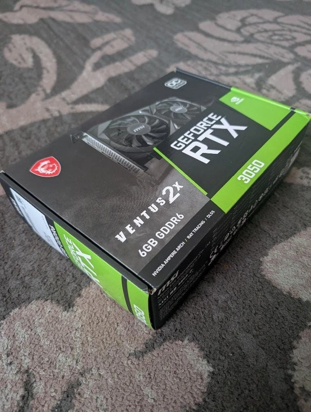 Used - Like new. MSI Gaming RTX 3050 Ventus 2X 6G OC Graphics Card with NVIDIA Ampere Architecture. Features 6GB GDDR6 memory, 1492 MHz boost clock, and 2 fans. Outputs include DisplayPort and HDMI. Compatible with desktop PCs. Cash accepted. Curbside pickup available.