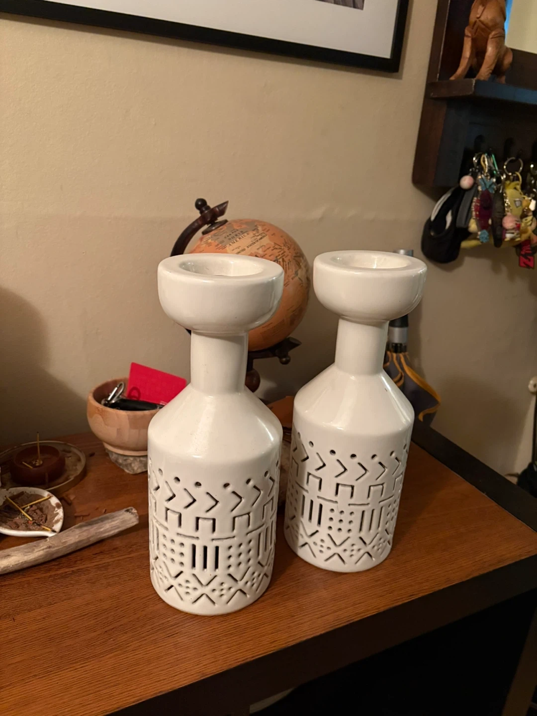 Selling a set of two white ceramic candle holders. They feature a unique cut-out geometric pattern along the base. These holders would add a stylish touch to any mantel or side table. Made of ceramic.
