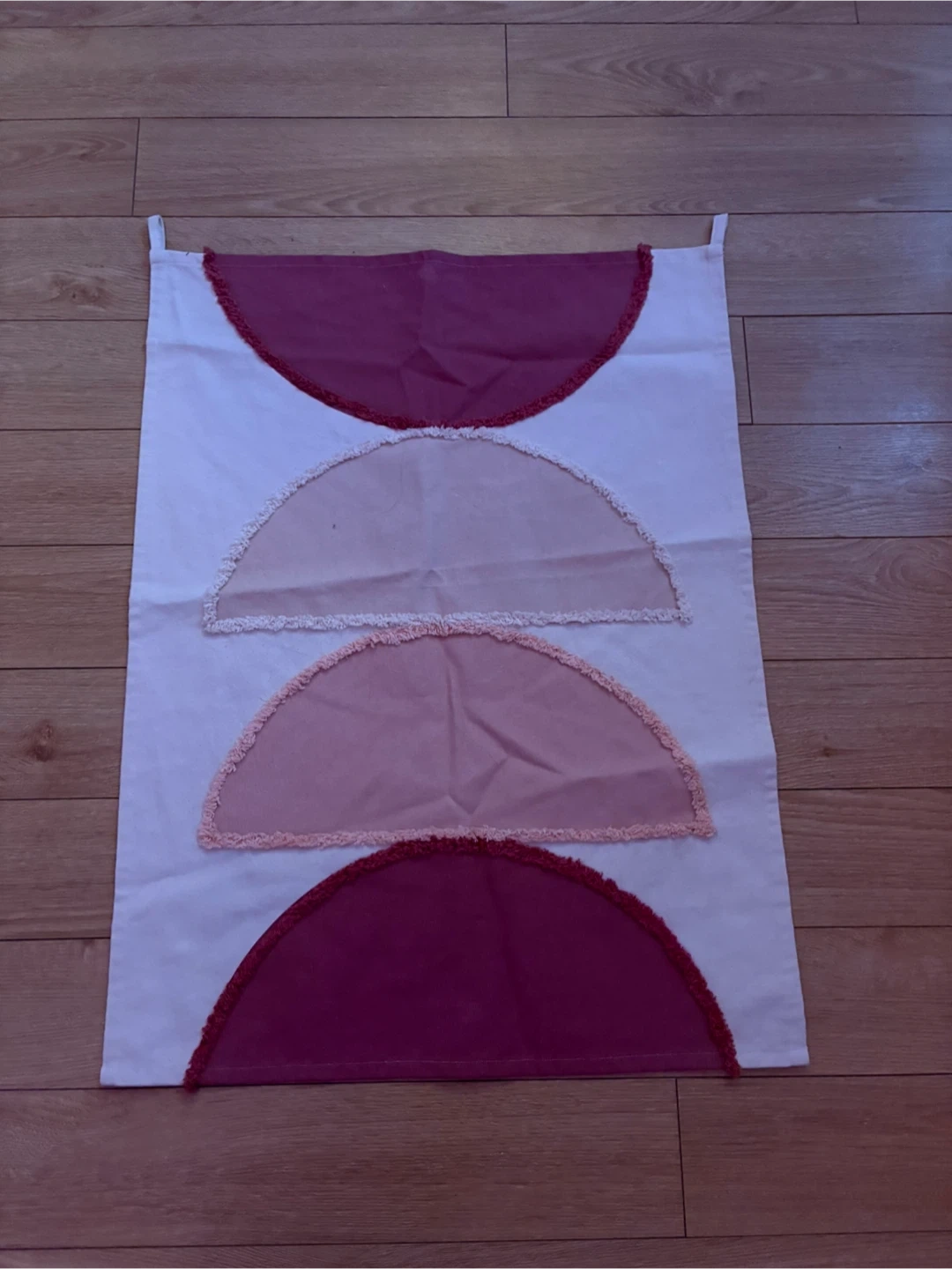 Fabric wall hanging featuring a pattern of semicircles in shades of pink and burgundy. Cotton material with fringed edges on the appliqués. Includes loops for hanging.