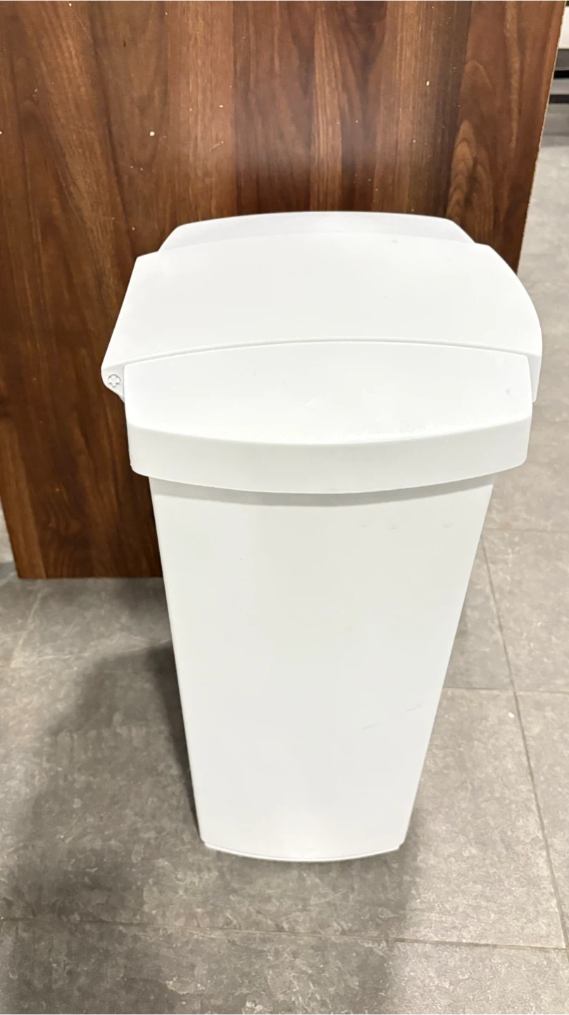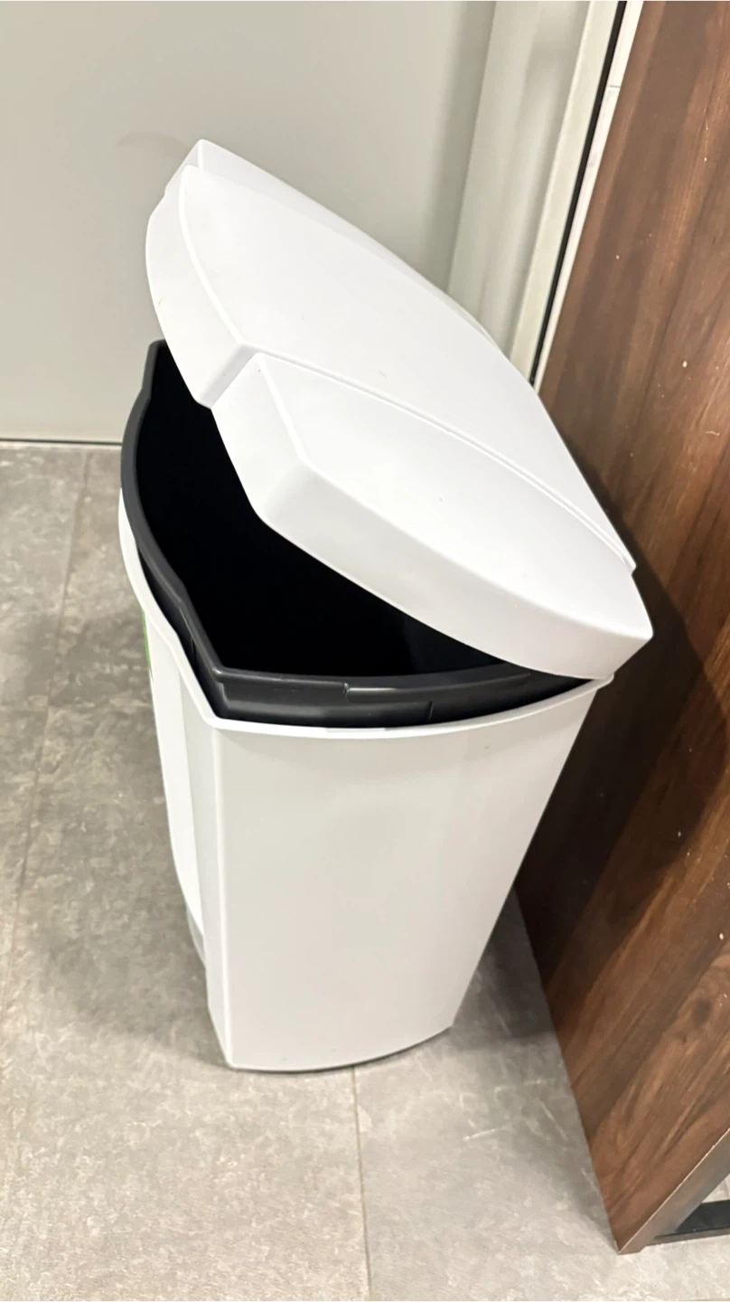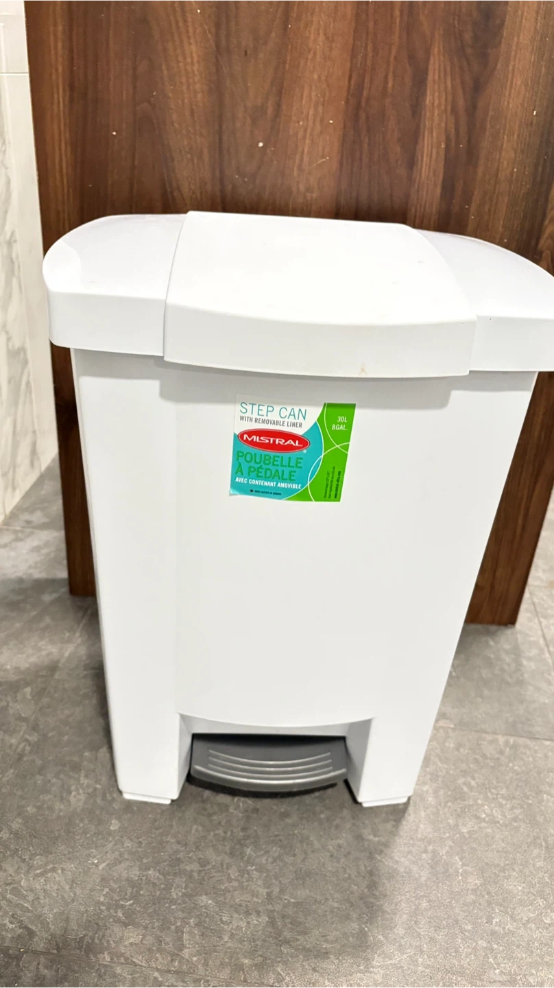 This MISTRAL step can is white and has a 30L capacity. It features a removable liner and a step pedal for hands-free operation. It's great for kitchens or bathrooms!