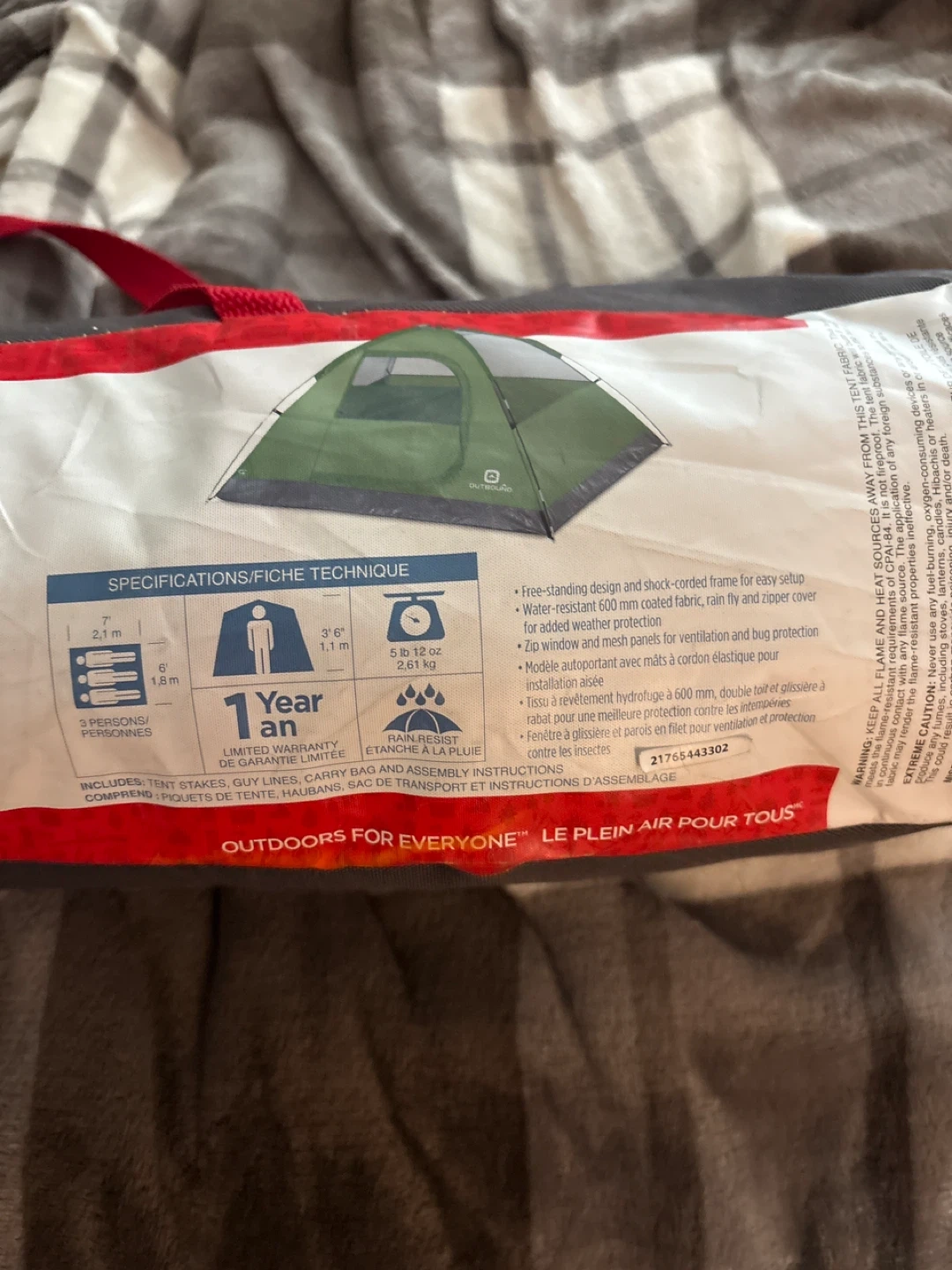 This Outbound dome tent is designed for 3 people. It features a water-repellent 600mm coated fabric and a zip window for ventilation. Includes tent stakes, guy lines, and a carry bag for easy transport.