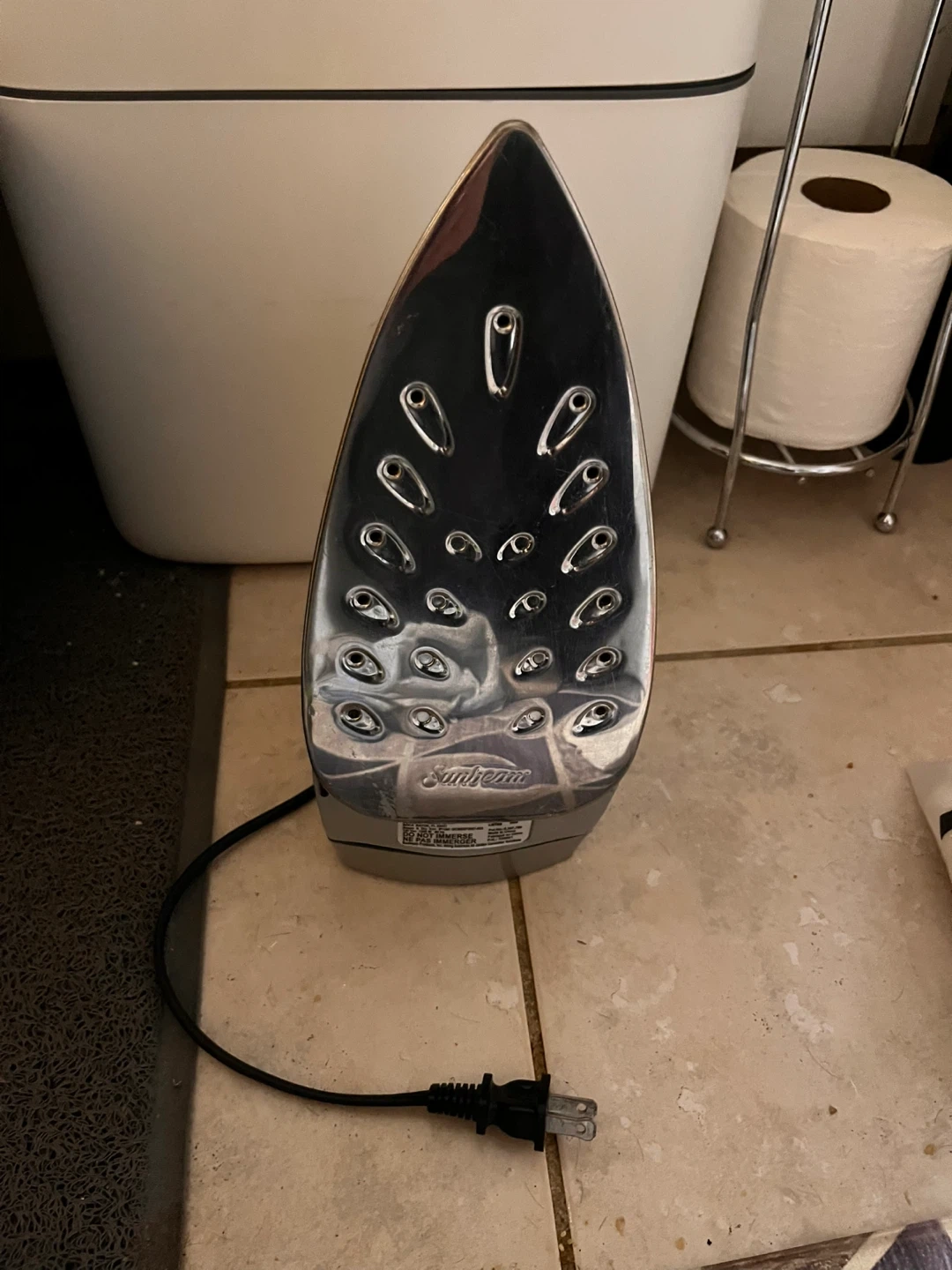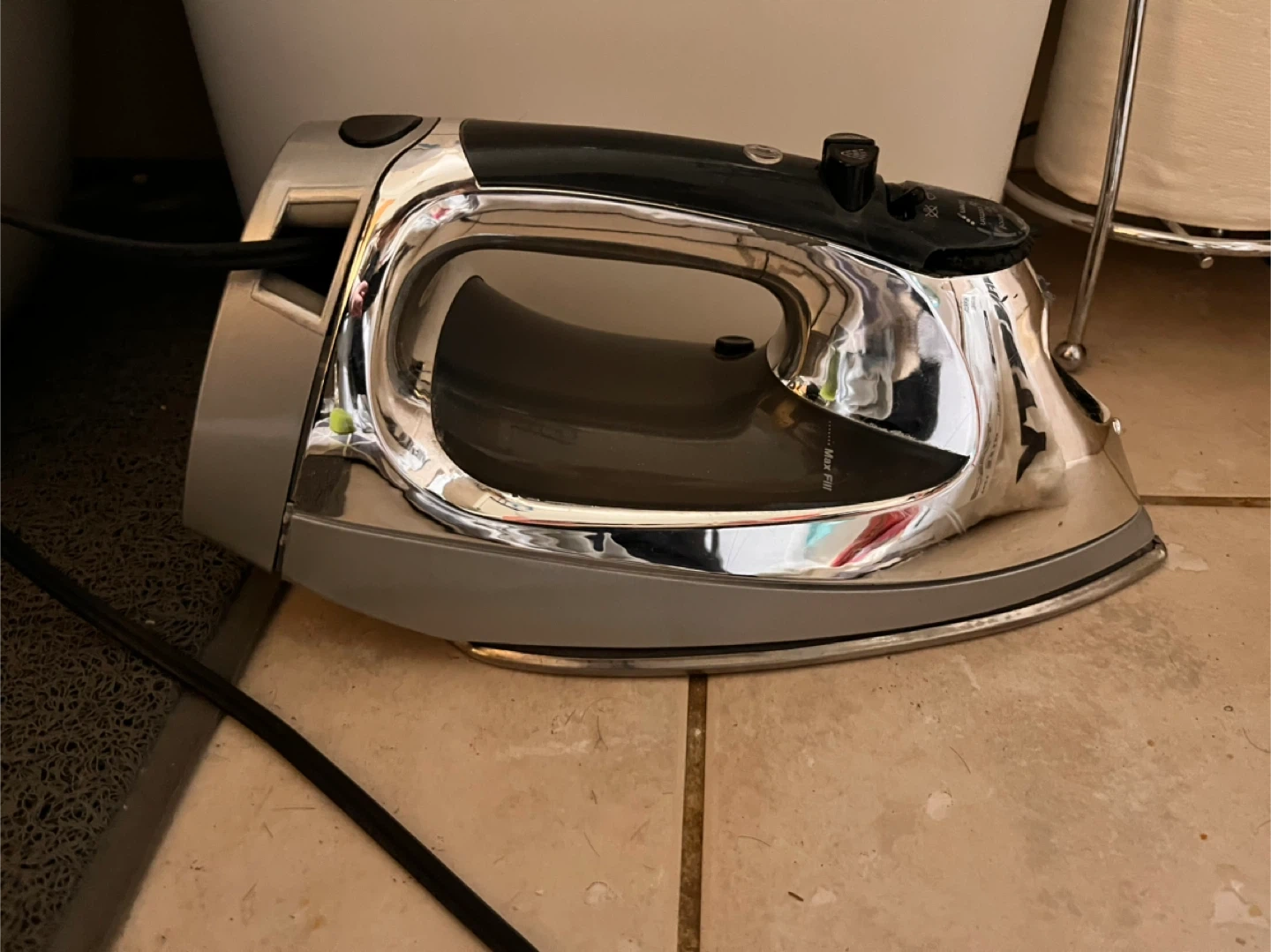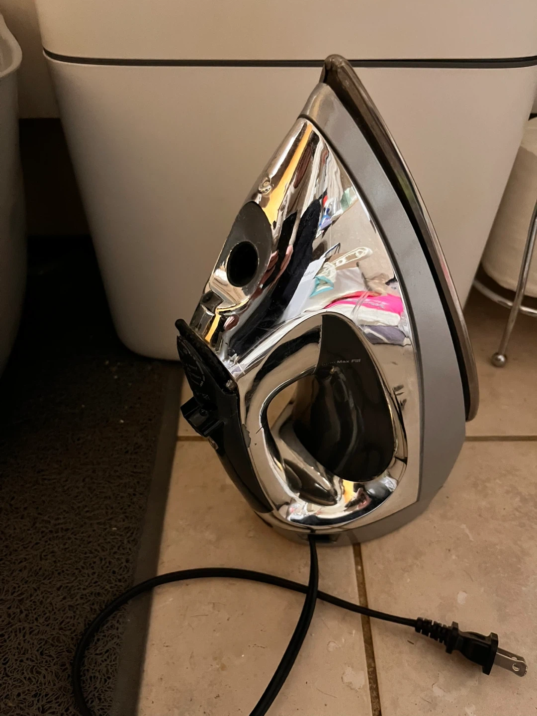 This Rowenta Steamforce iron offers an extremely powerful burst of steam. It has an integrated electronic steam pump for better performance. The iron is blue and silver with a chrome soleplate. Missing water close