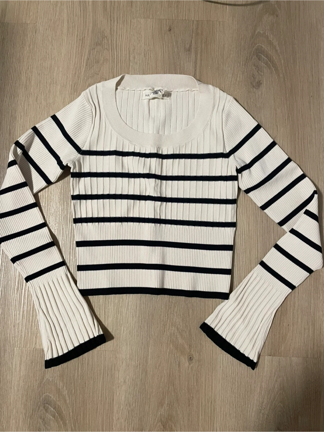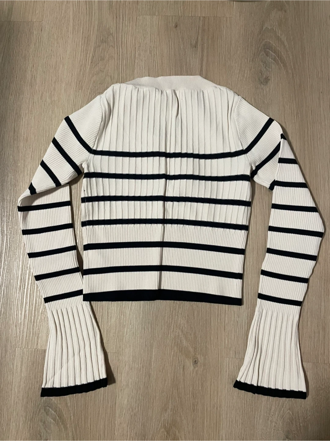 Cream coloured black striped long-sleeve top. A good basic for fall and winter. Basically new, worn only once. Great condition, no damage.