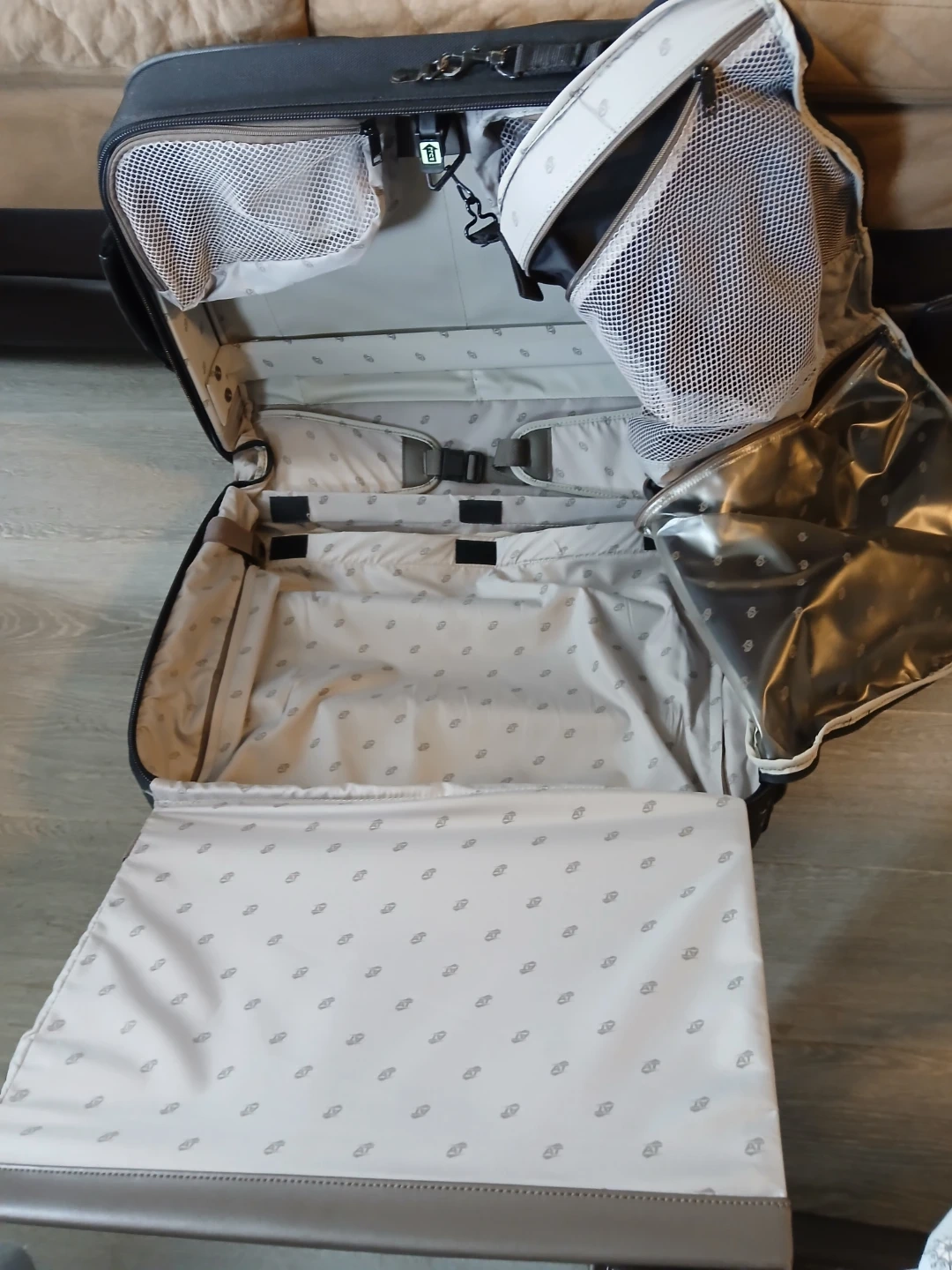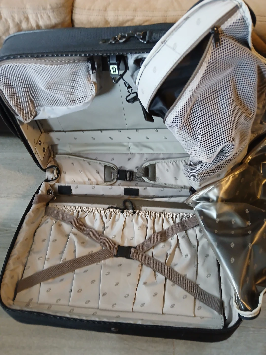 Black fabric rolling suitcase with telescoping handle. Features multiple exterior pockets and a spacious interior with compression straps. Interior lining has a patterned design. It's a great size for travel!
