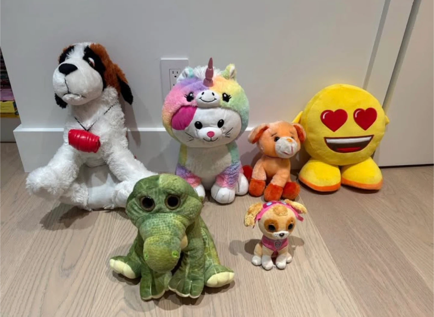 Selling a collection of gently used plush toys! There's a variety of characters, including a dog, a rainbow unicorn cat, an emoji with heart eyes, a green alligator, and a Paw Patrol Skye. They're all in good condition and ready for a new home!