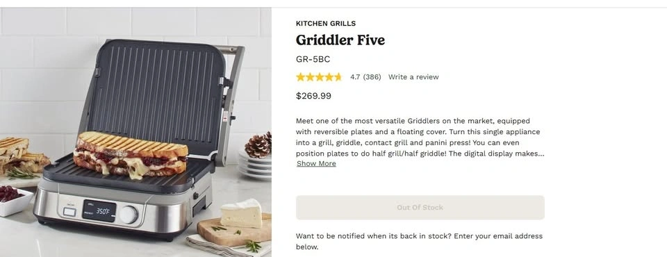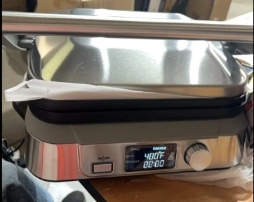 Cuisinart GR-5BP1 Electric Griddle FIVE. Enjoy 5-in-1 Functions, LCD Display, Wide Temperature Range and Sear Function, Stainless Steel. The Griddler FIVE has a sleek contemporary design and can be used as a contact grill, panini press, full grill, full griddle, and half grill/half griddle. The LCD Display shows function, temperature, and timer with user-friendly digital controls, top cover and handlebar. Adjustable temperatures from 175 - 450 degrees with a sear function.