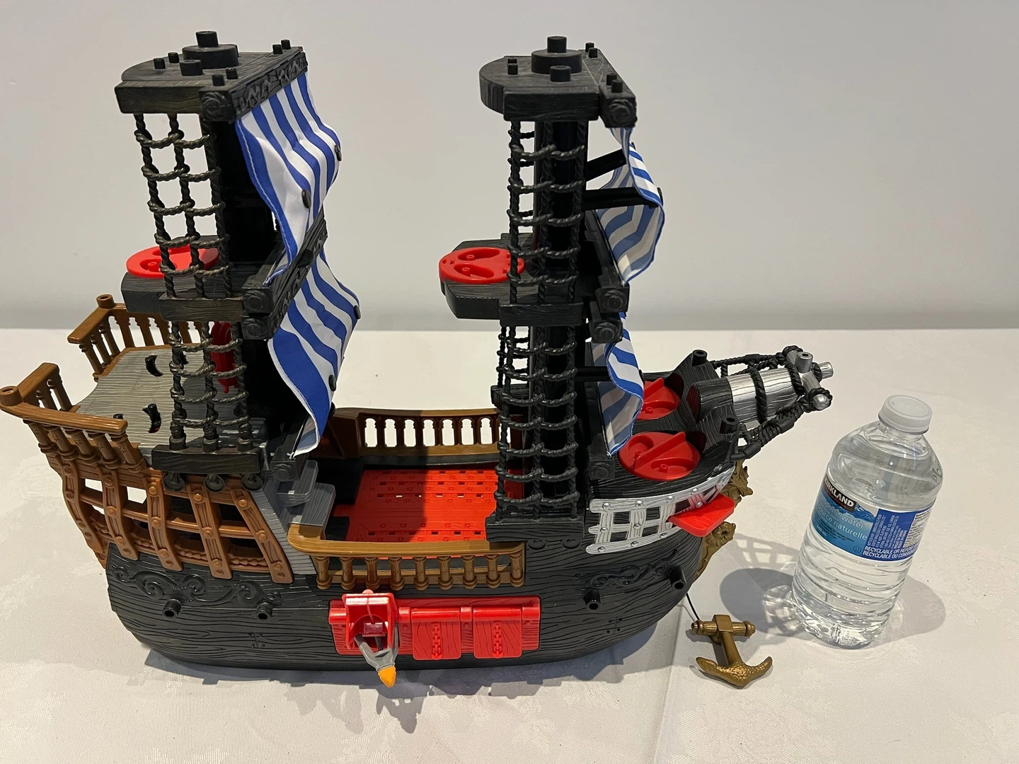 This is a Fisher-Price pirate ship toy. It's made of plastic and comes with a golden anchor accessory. It features two masts with blue and white striped sails.