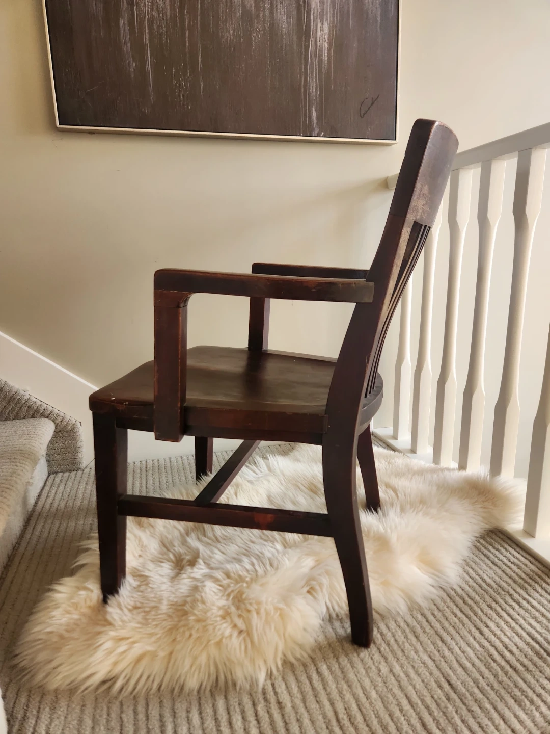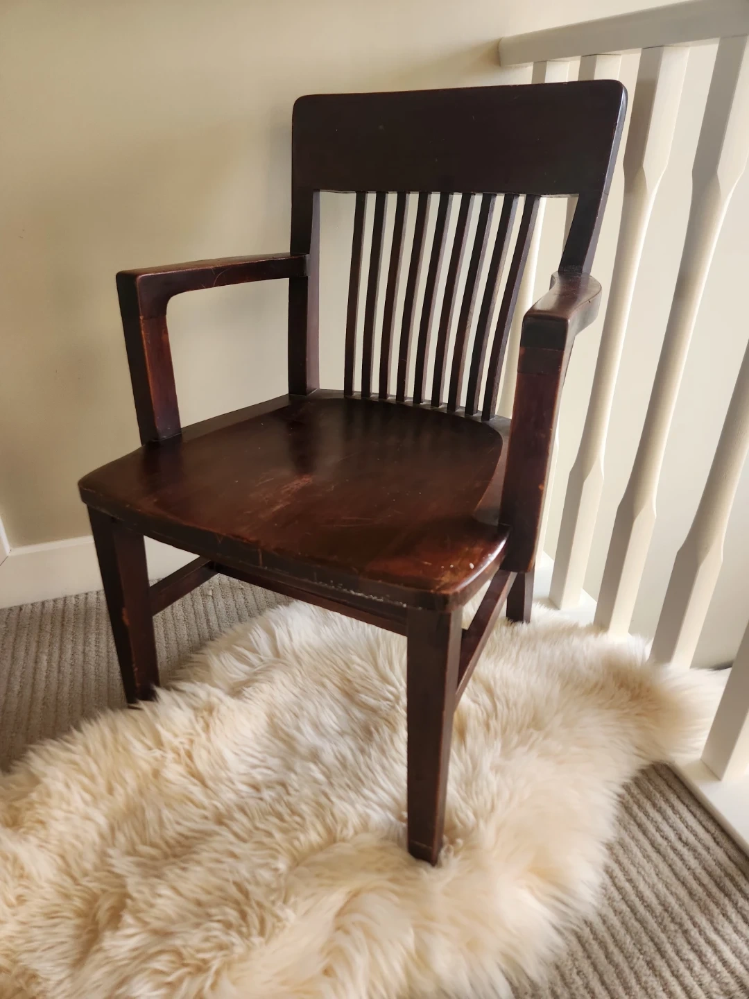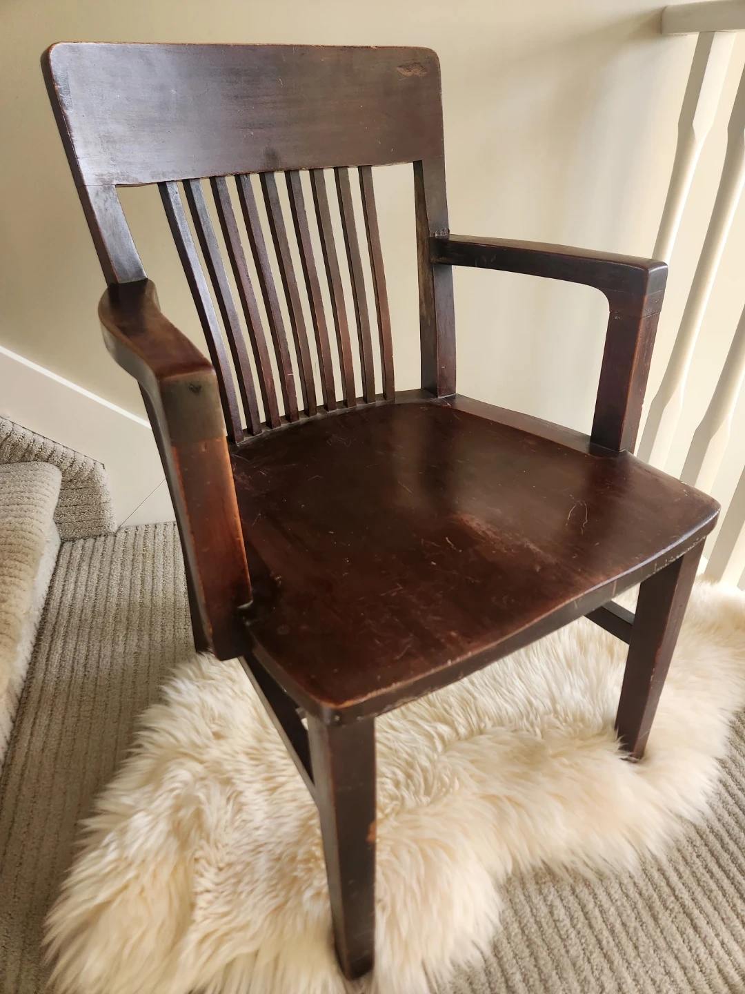This collectible 1920s chair has a gorgeous craftsman design. This Sturdy and stylish armchair by John Wanamaker furniture designers is a lovely dark wood chair with a slatted back and arms. Perfect for a study or library space! Seat surface is 20 x 20, seat is 17 inches high, top of chair back is 33 inches high and the arms are 22 inches apart.