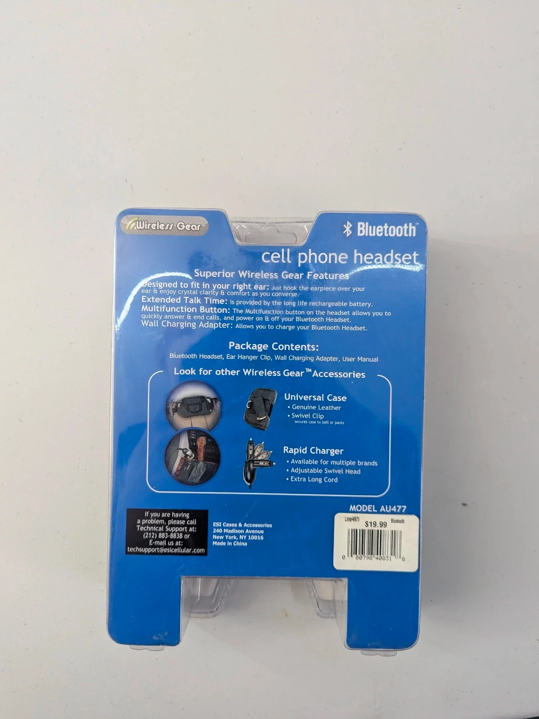 This Wireless Gear Bluetooth cell phone headset is designed for the right ear and offers extended talk time. It features a multifunction button for easy control and comes with a padded earbud for comfort. A wall charging adapter is included for convenience.