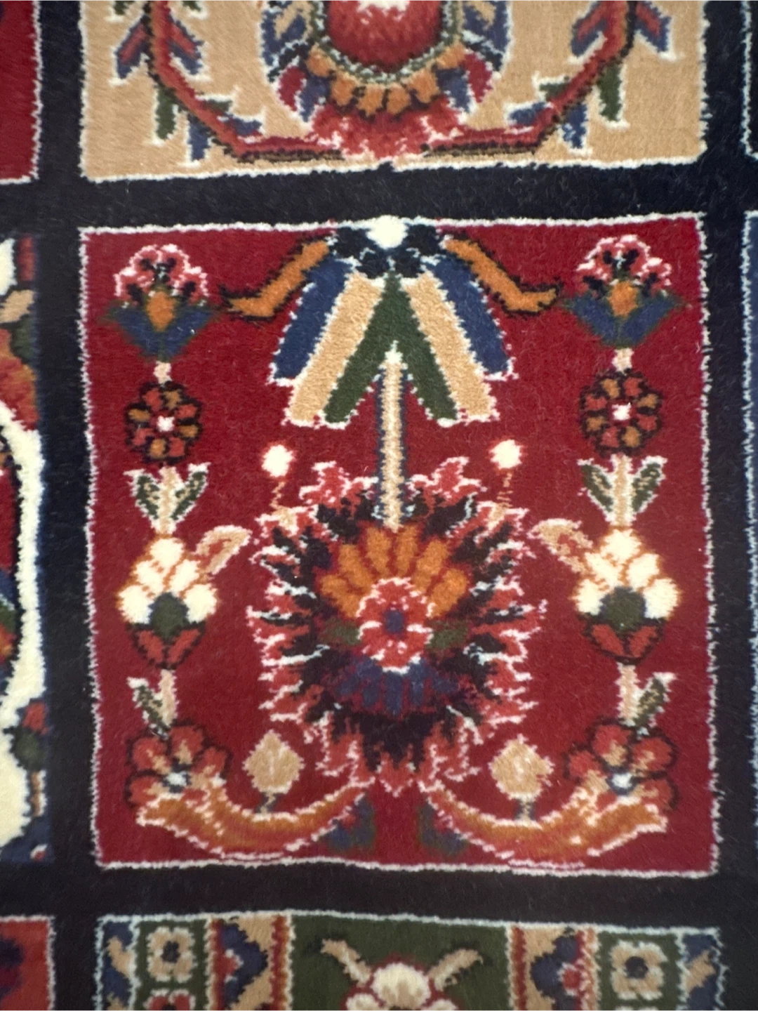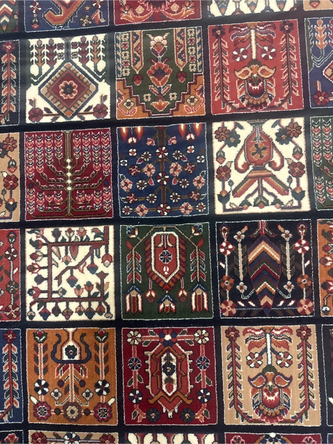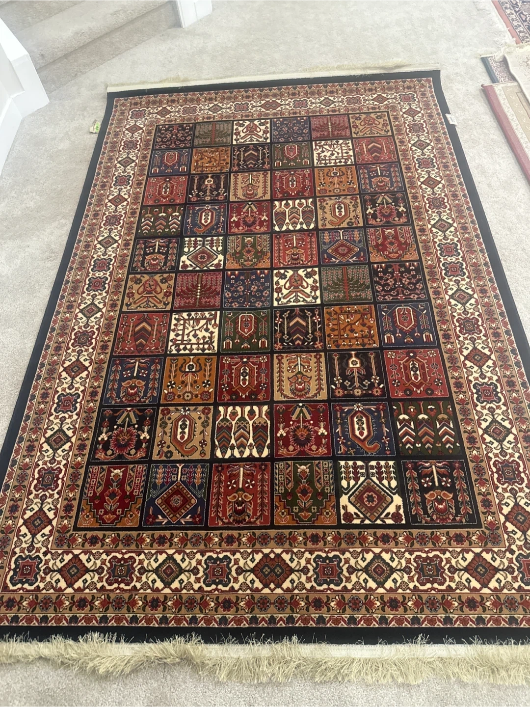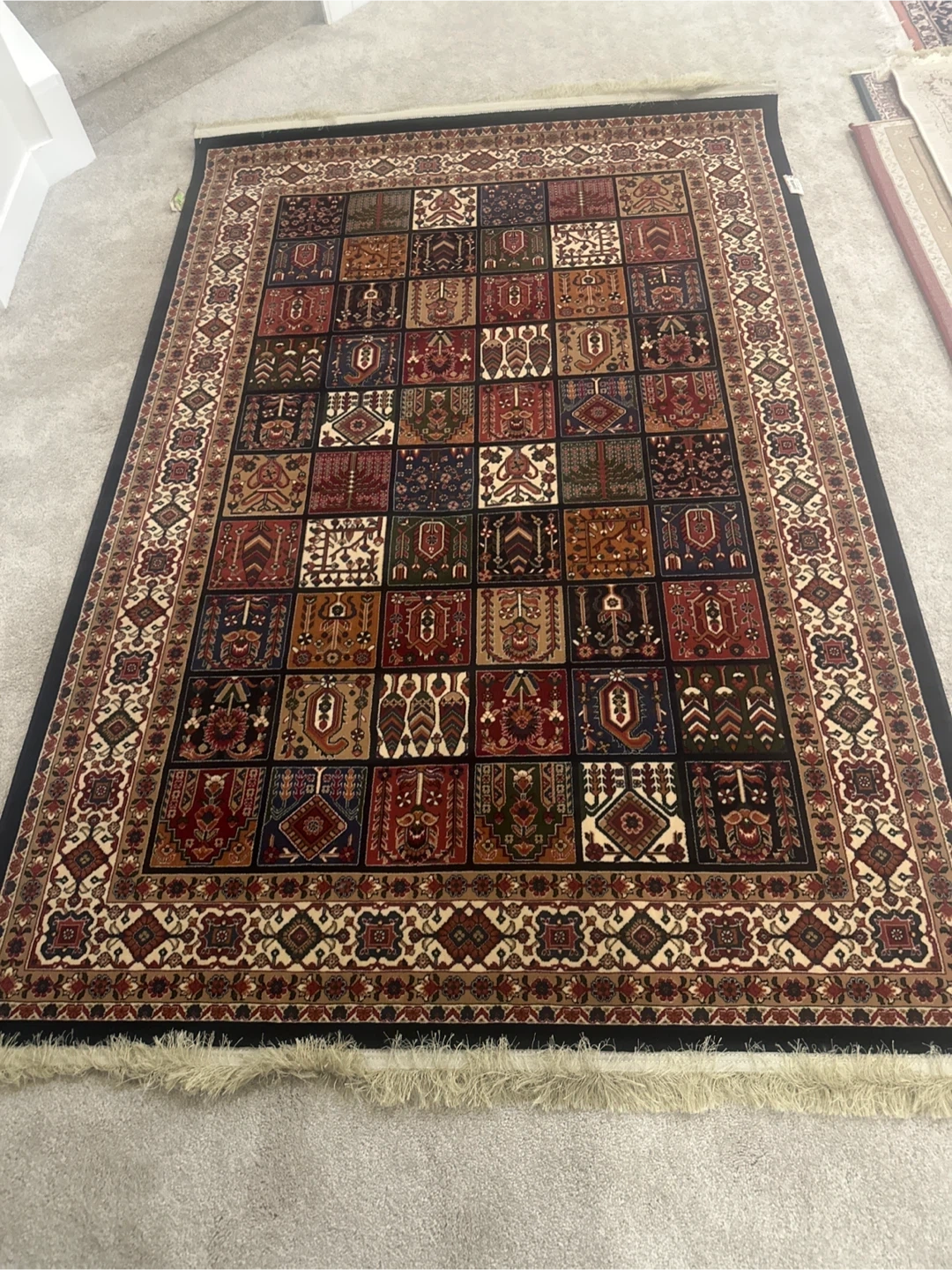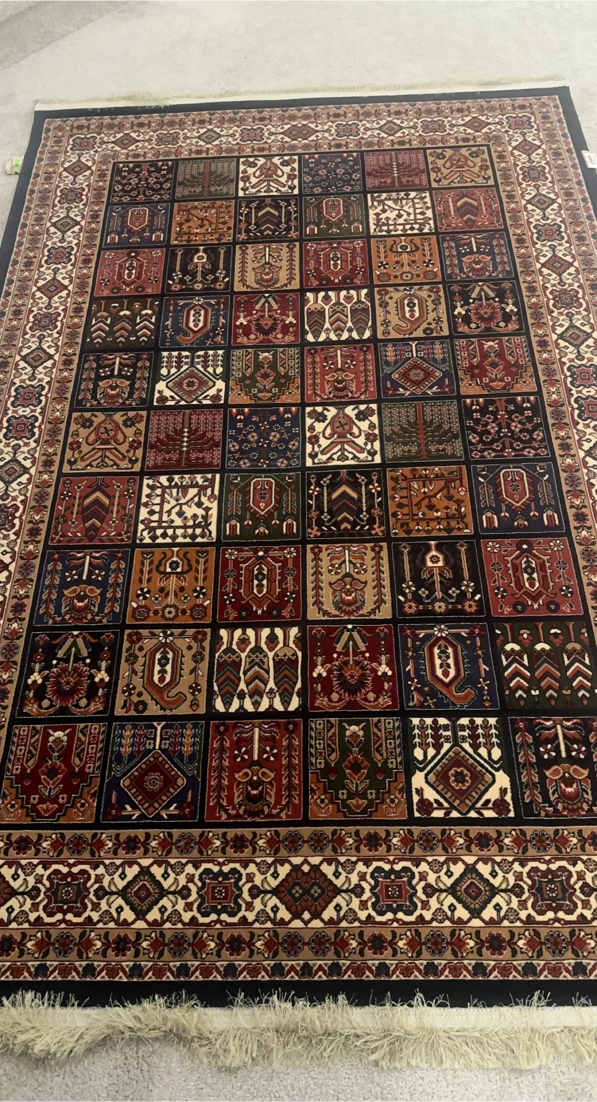 This beautiful luxury carpet features a detailed traditional pattern with squares of varying motifs. It has a fringe detail on both ends, and a decorative border. It's a lovely accent piece for any room! Reeds 700, Picks 2100. Made in Iran.