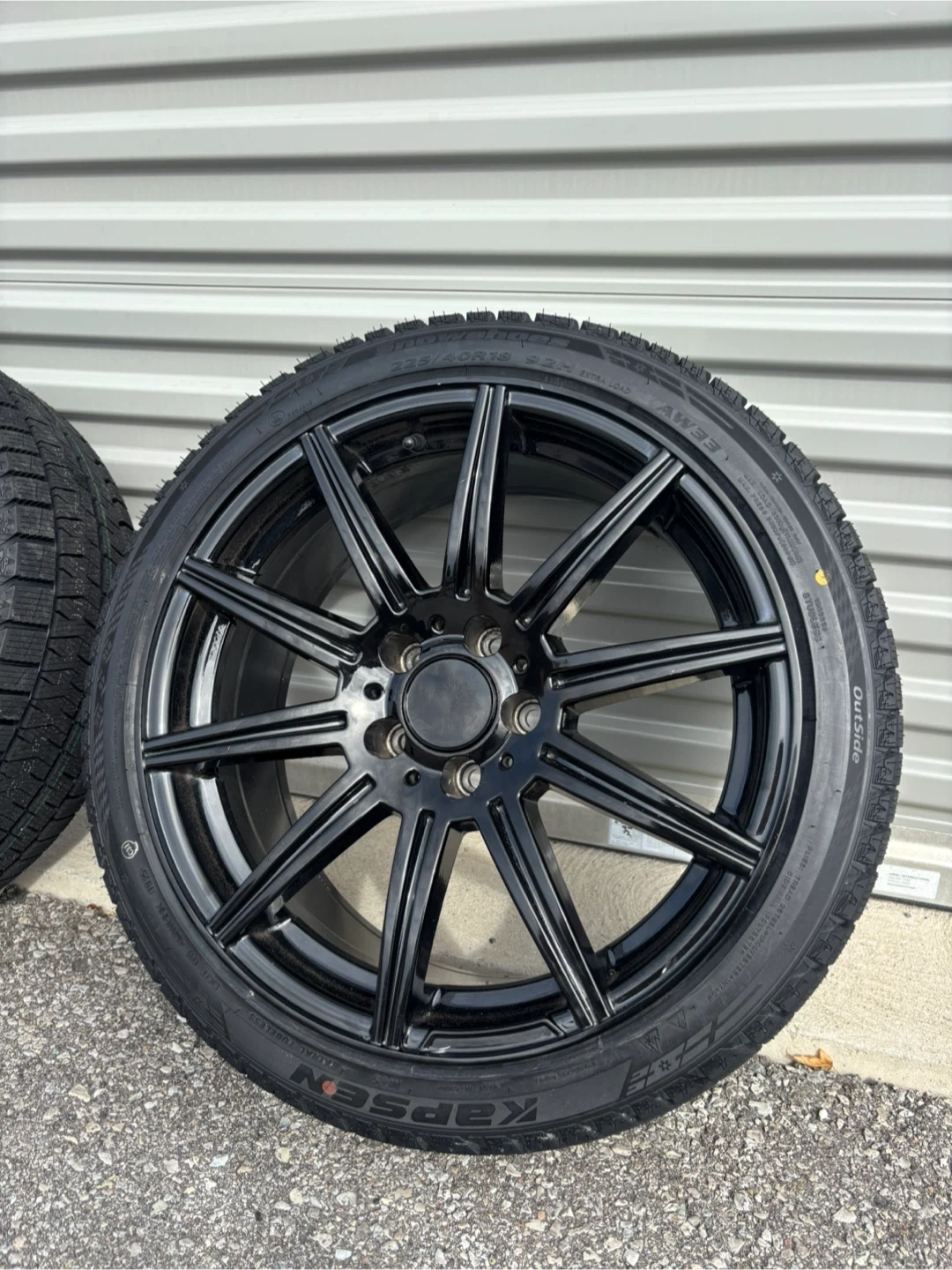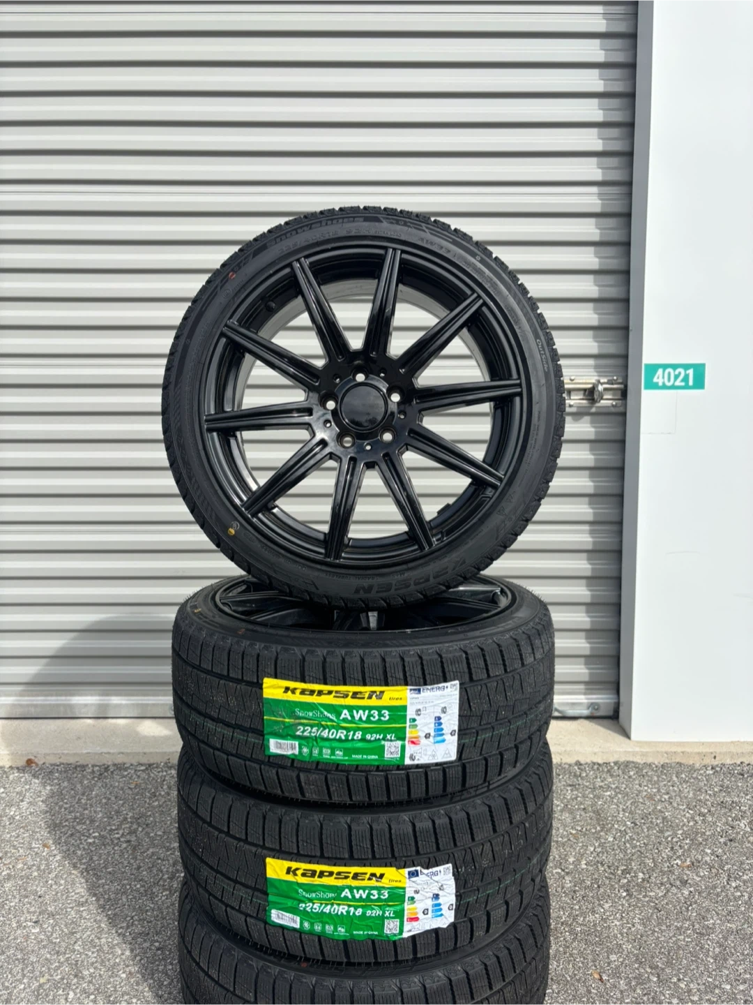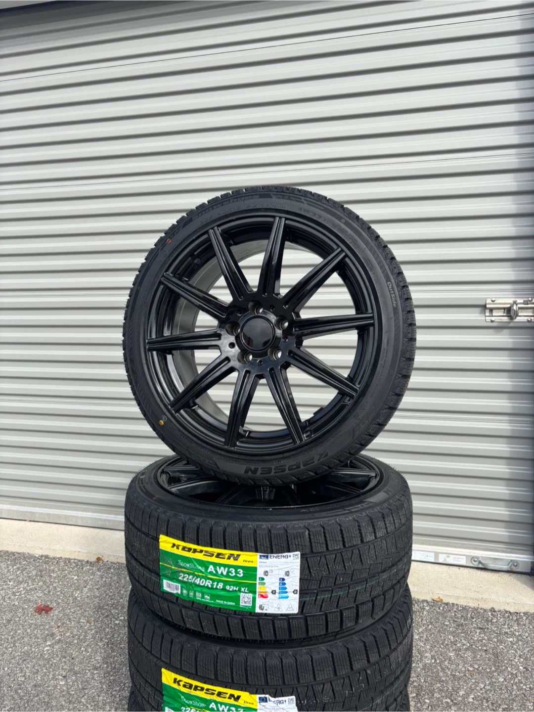 Selling a set of 5x112 wheels with brand new winter tires. 5x112 bolt pattern 66.6 hub bore 18x8 32 offset No bends cracks or curb rash. Wheels are in great shape. 225/40R18 kapsen snowshoes winter tires, brand new. 2025 DOT. just mounted and balanced. Ready to be put on a car! Serious inquiries only, pickup only Kennedy and mayfield caledon.