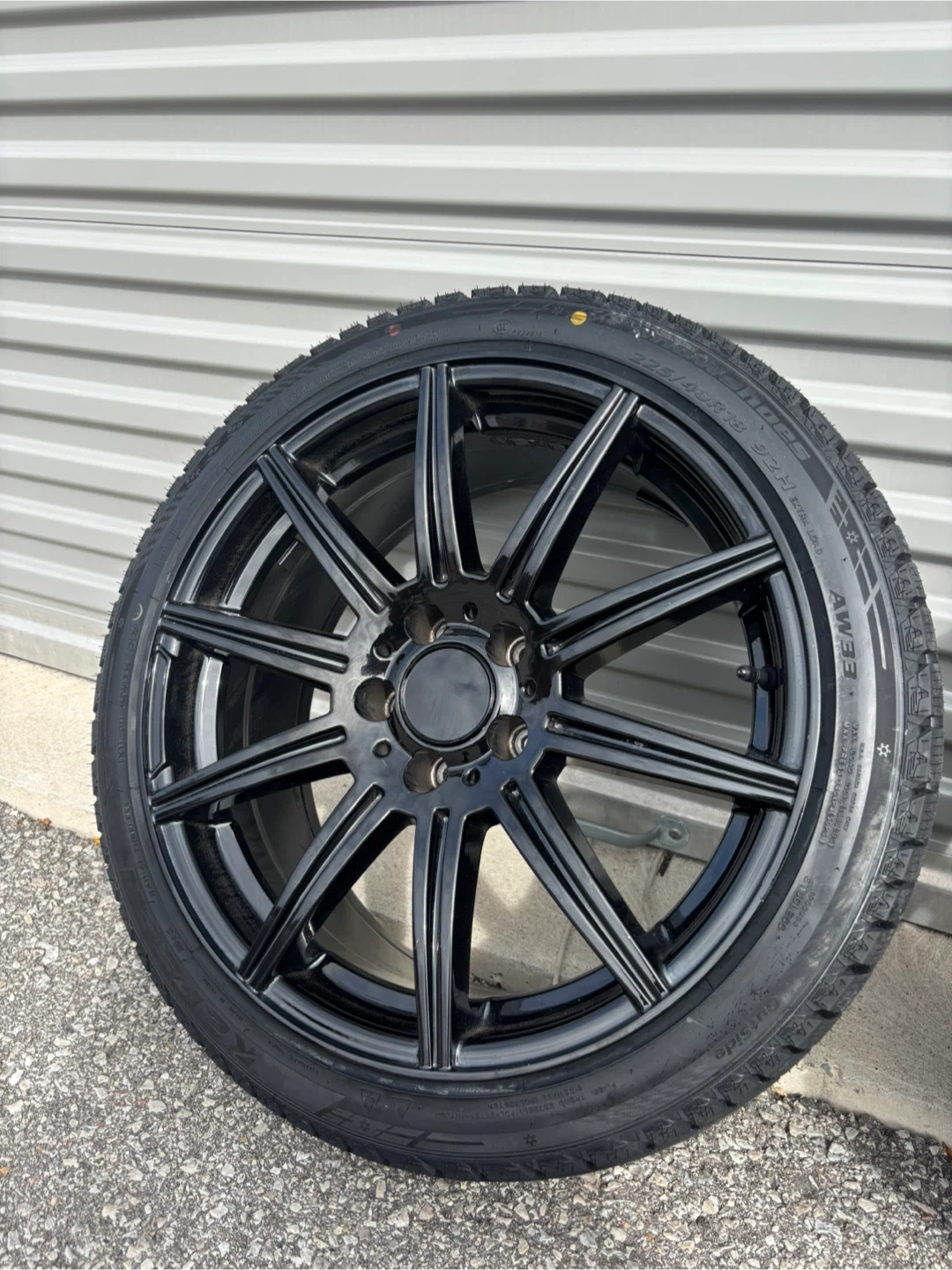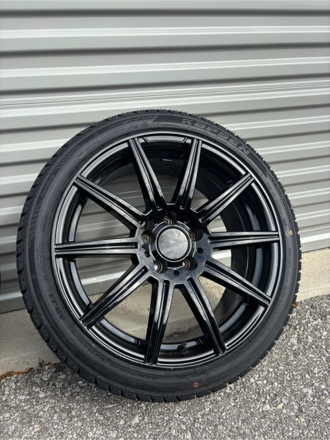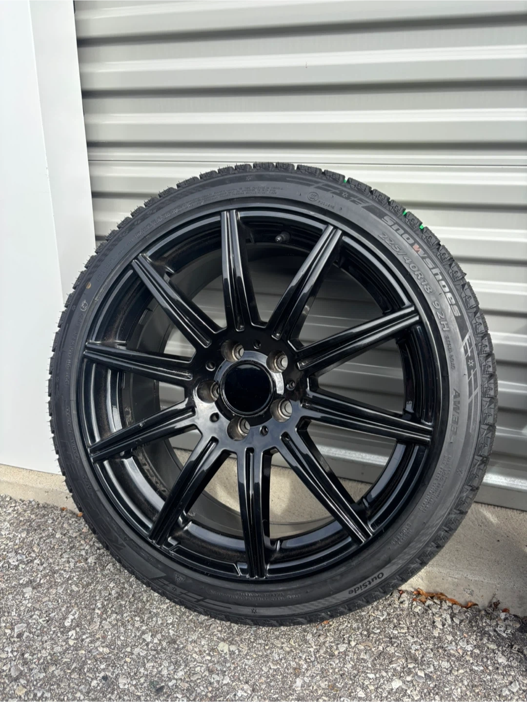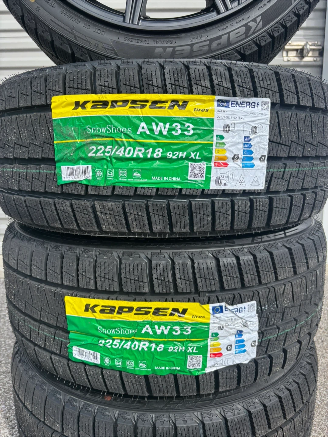 Selling a set of 5x112 wheels with brand new winter tires. 5x112 bolt pattern 66.6 hub bore 18x8 32 offset No bends cracks or curb rash. Wheels are in great shape. 225/40R18 kapsen snowshoes winter tires, brand new. 2025 DOT. just mounted and balanced. Ready to be put on a car! Serious inquiries only, pickup only Kennedy and mayfield caledon.