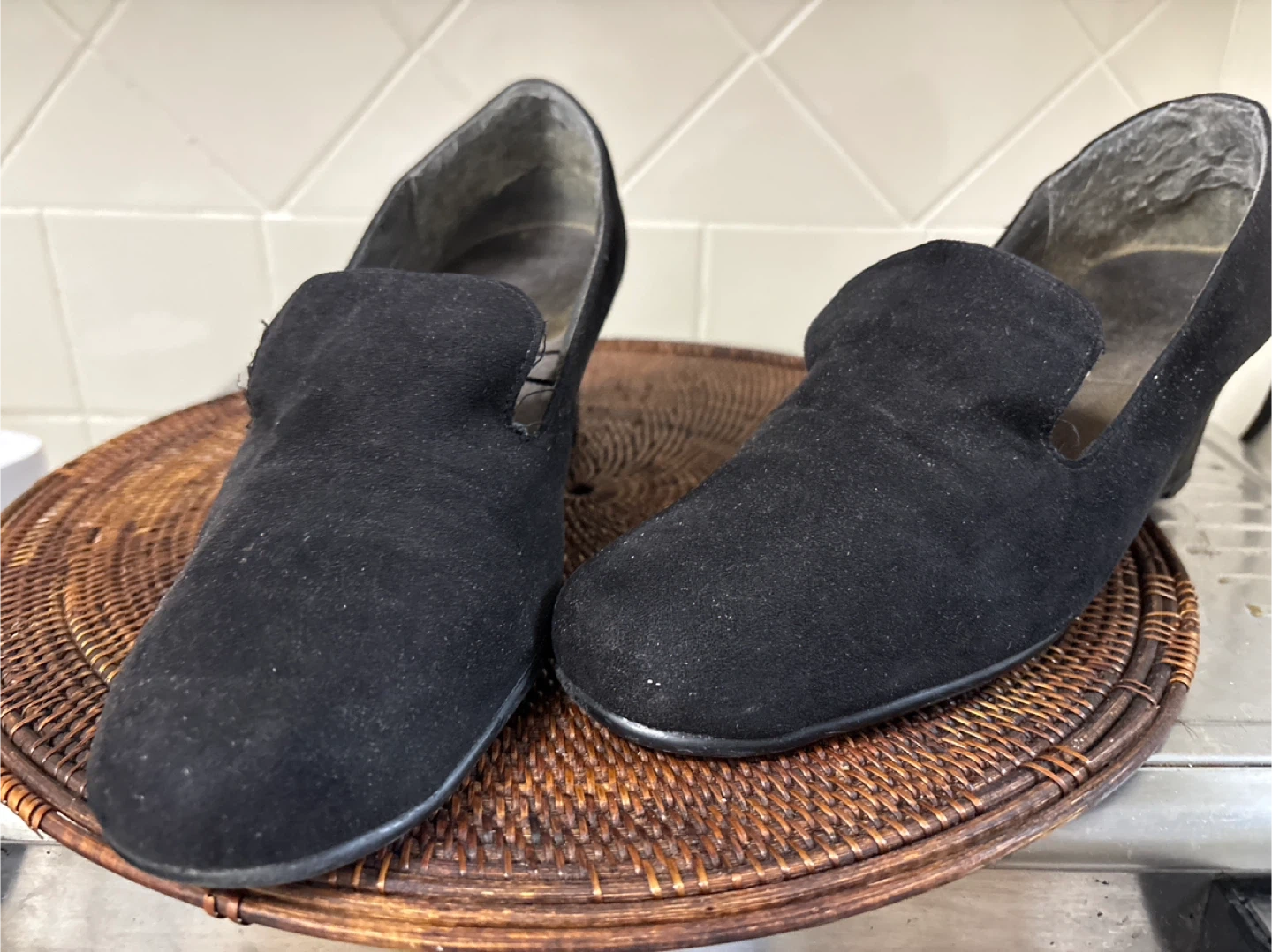 These Aerosoles wedge heels are black and made of suede. They have a slip-on style with a rounded toe. The wedge heel provides comfortable height.