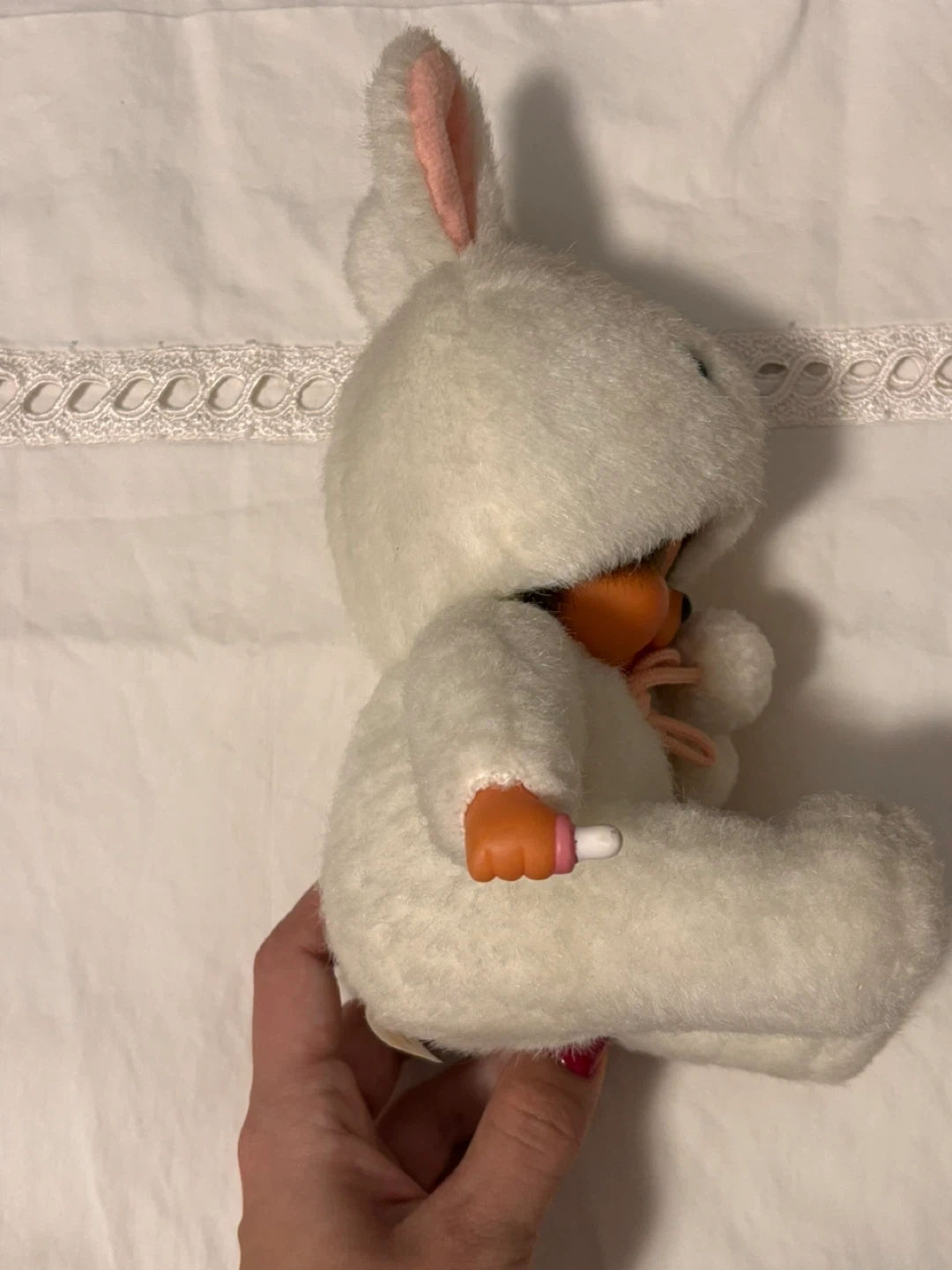 This is a classic Monchhichi doll dressed in a cozy white bunny costume. It's a cute collectible plush toy with its signature look. The doll comes with a bottle accessory.