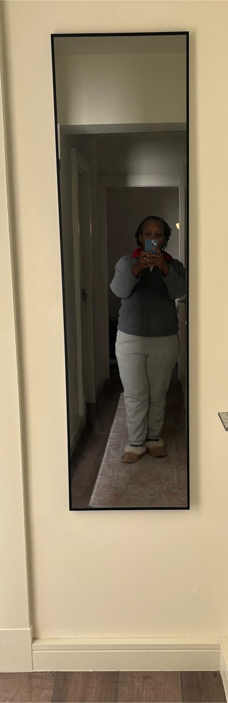 Tall full-length mirror with a sleek black frame. Its minimalist design fits any room decor. Has both a floor stand and screws for the wall. Great for checking your outfit before heading out!
