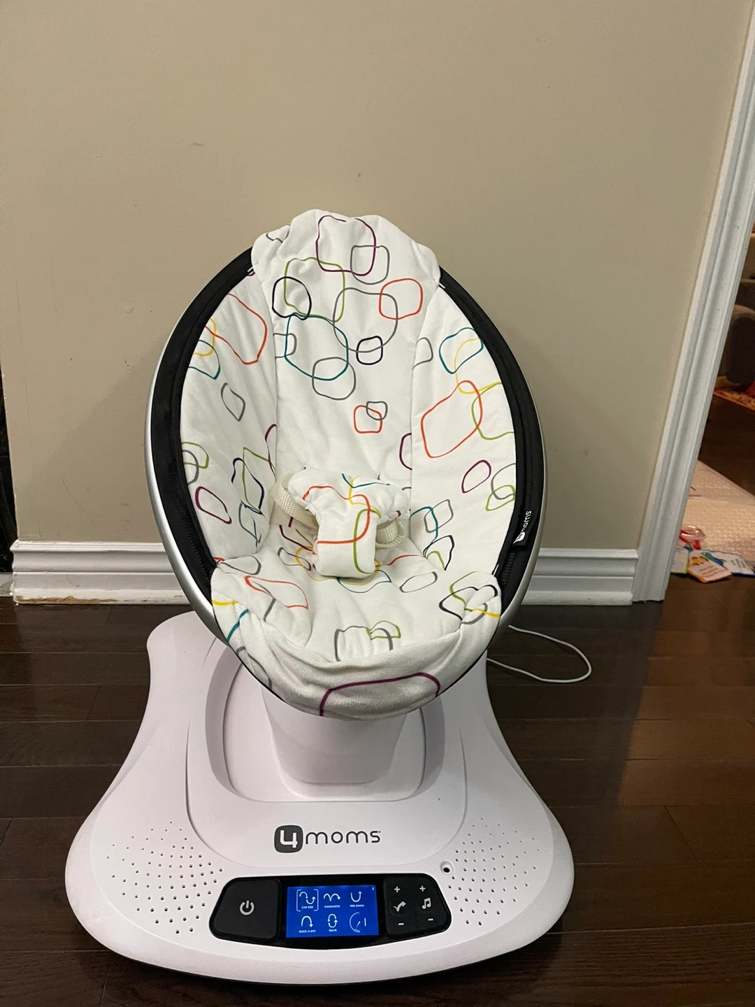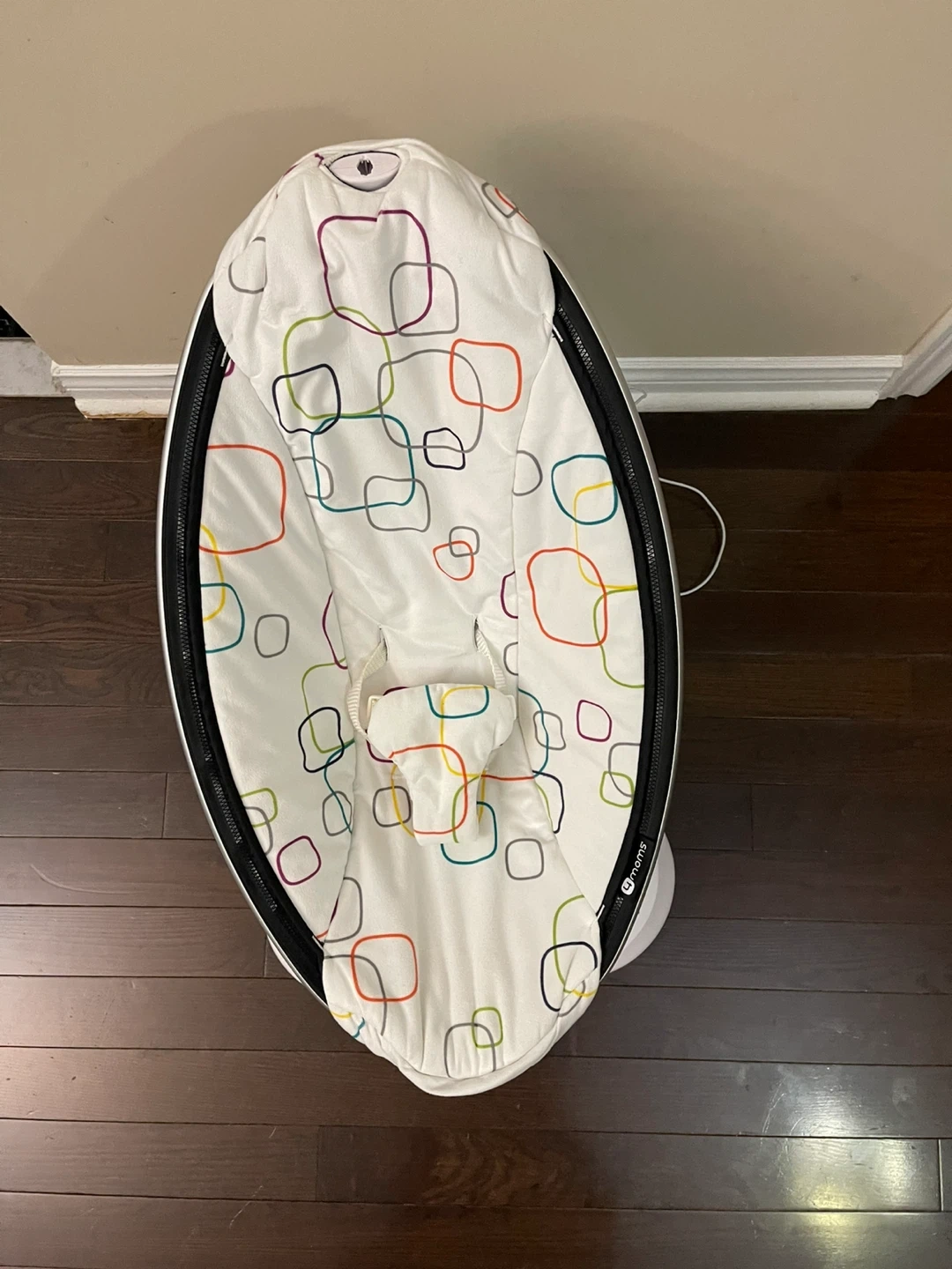 This is a 4moms MamaRoo baby swing with a white seat featuring a colorful block pattern. It has multiple motion settings and Bluetooth connectivity for music. It's perfect for soothing your little one!