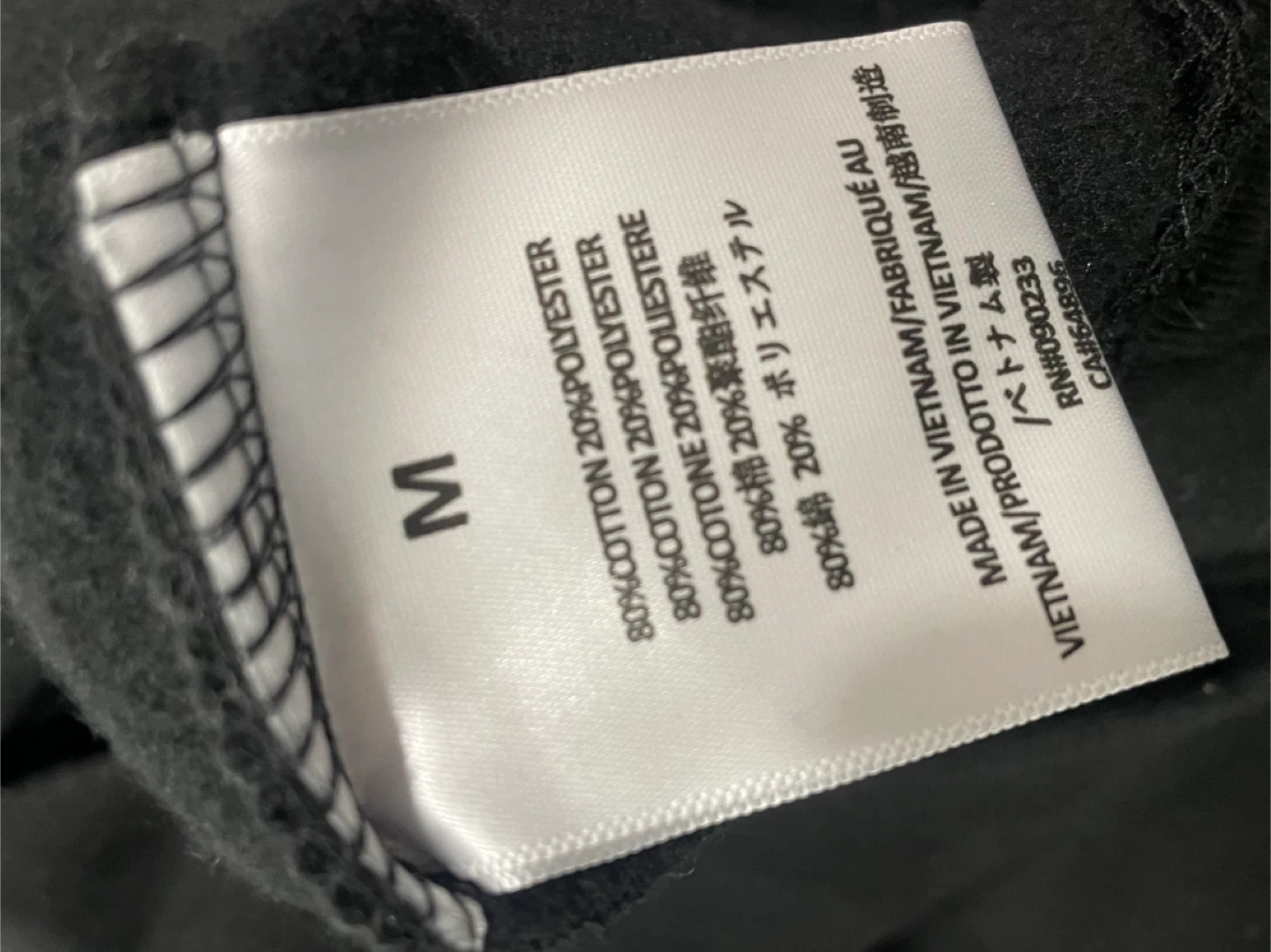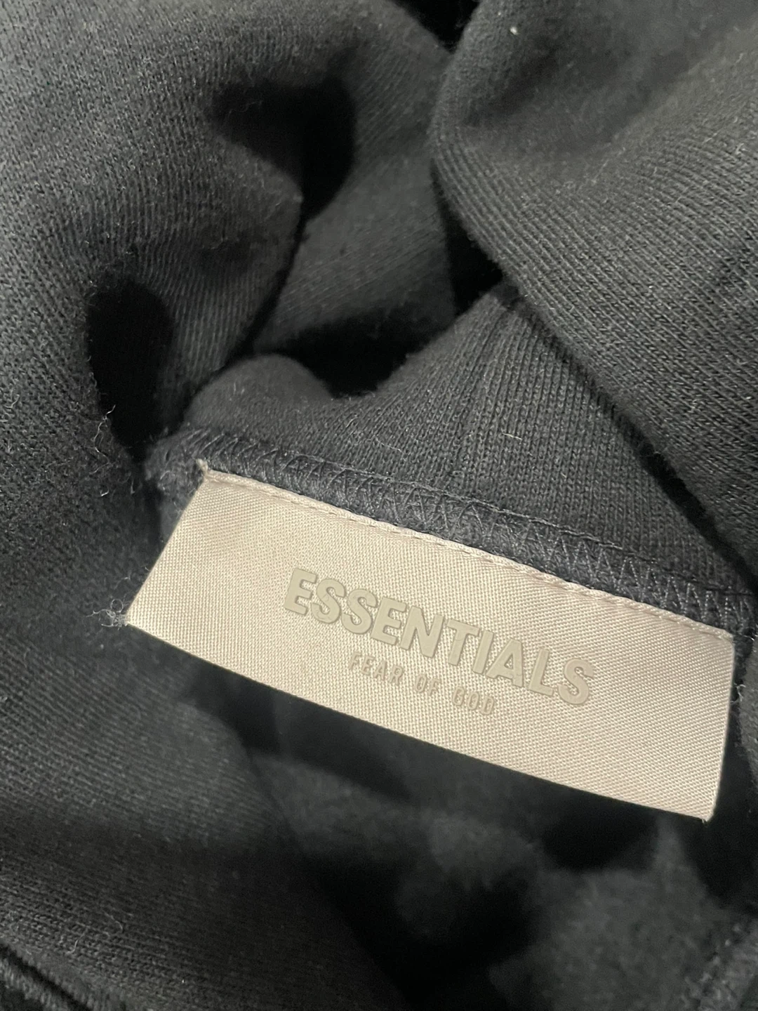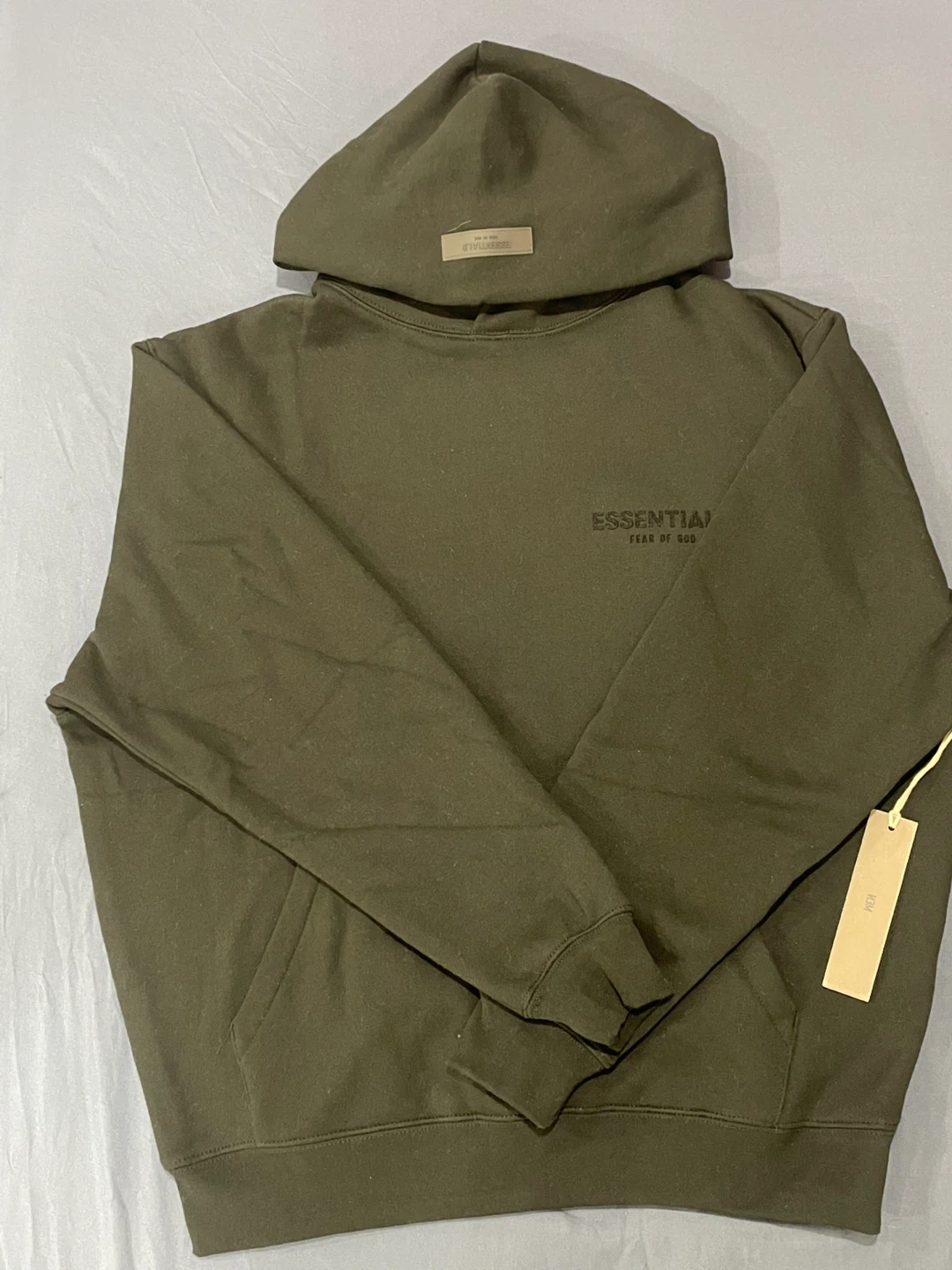 This is a Fear of God Essentials hoodie in size Medium. It's made of 80% cotton and 20% polyester. This pullover hoodie has a classic design with a front pouch pocket and a drawstring hood. It's a comfortable piece for everyday wear.