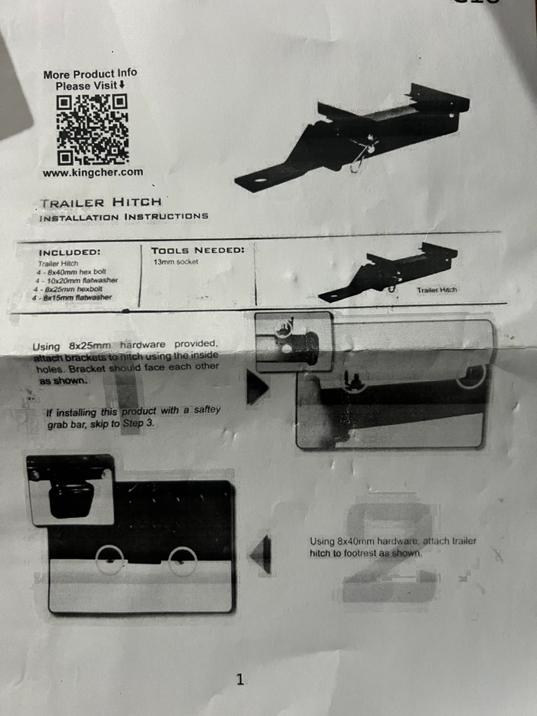 New, unused Kingcher trailer hitch. Includes all hardware and instructions. For ATVs, UTVs, or golf carts. Easy installation.