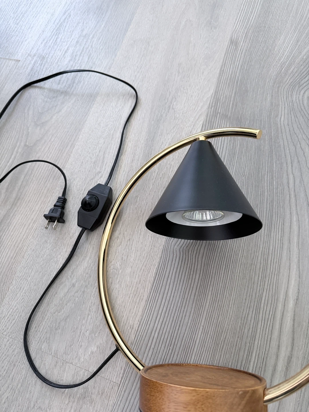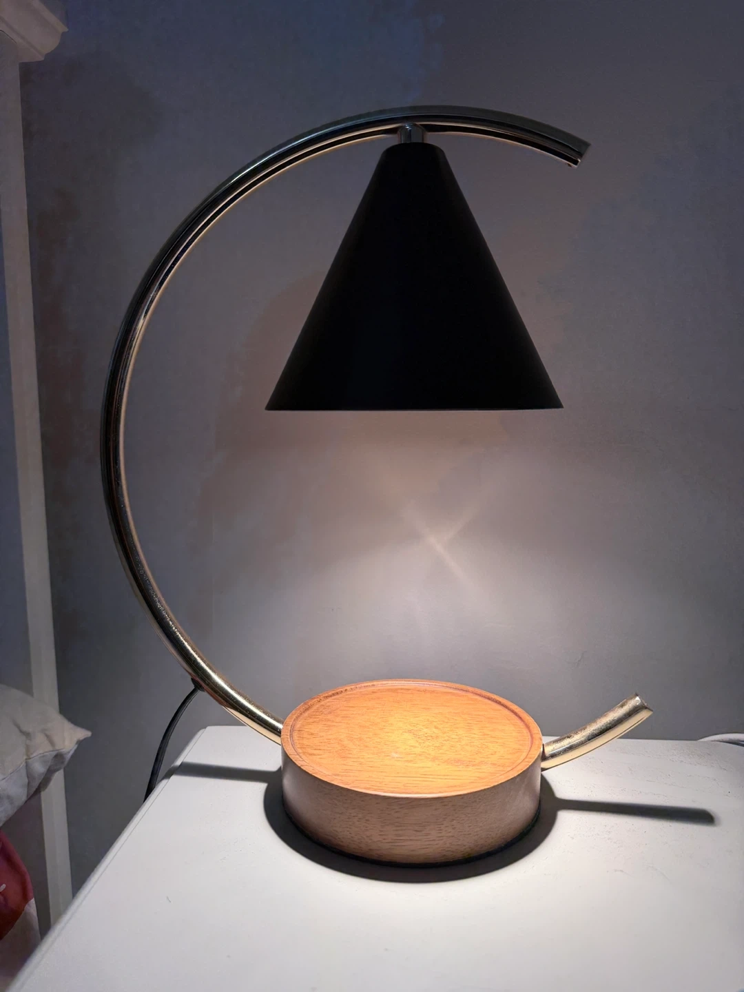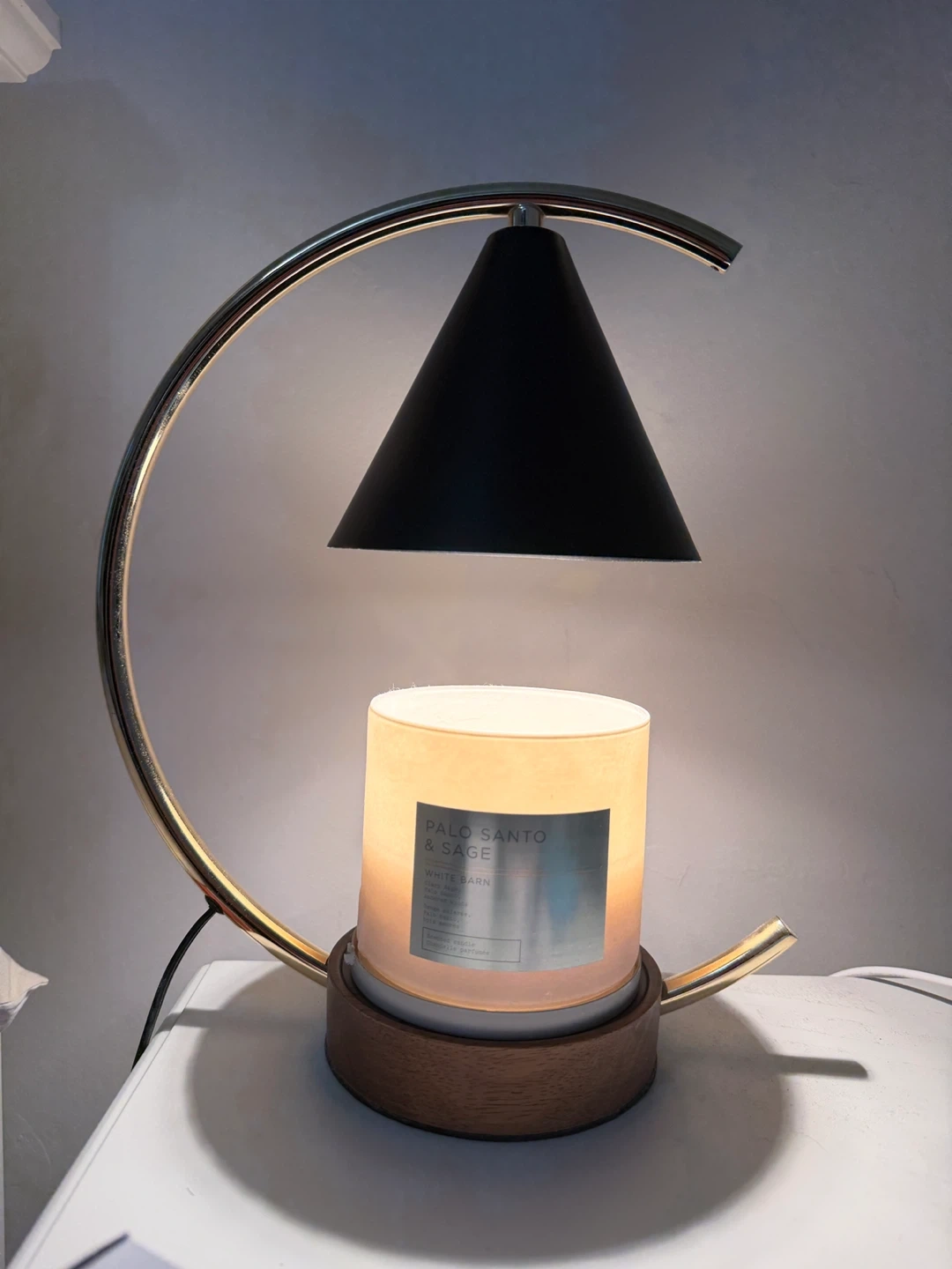 This electric candle warmer lamp is designed to melt candles and release fragrance without an open flame. It controls by dimming switch. It features a modern gold and black metal design with a wood base. It comes with a replacement bulb and is in good working condition.