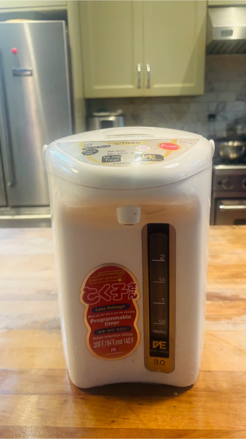 Tiger electric water boiler with a 3.0L capacity. It features programmable temperature settings at 208, 194, and 140°F, along with a re-boil timer. This appliance also has a VE Vacuum & Electric mode. It's handy for keeping water at your preferred temperature throughout the day!