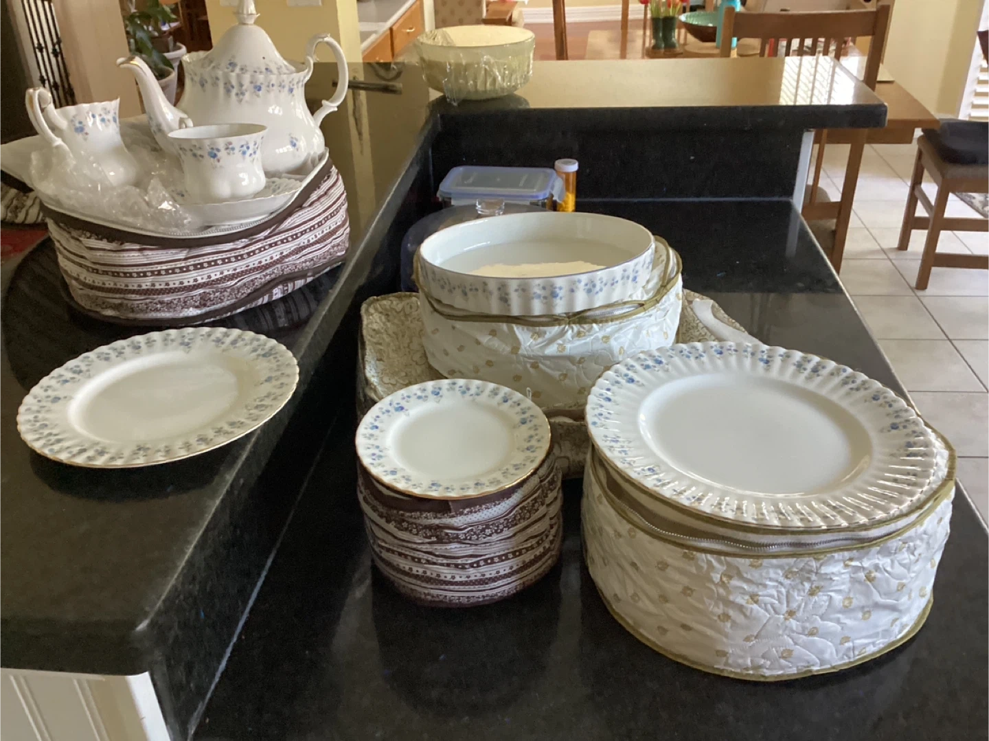 A beautiful Royal Albert tea set featuring a delicate blue floral pattern on white china. It includes a teapot, cups, and saucers, all neatly stored in patterned cases. The set also comes with several plates for a complete service. It's perfect for those who enjoy hosting tea parties or collecting antique dinnerware.