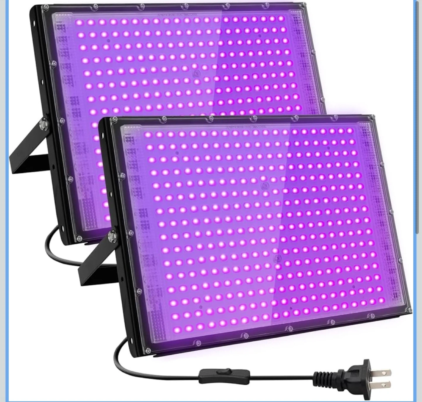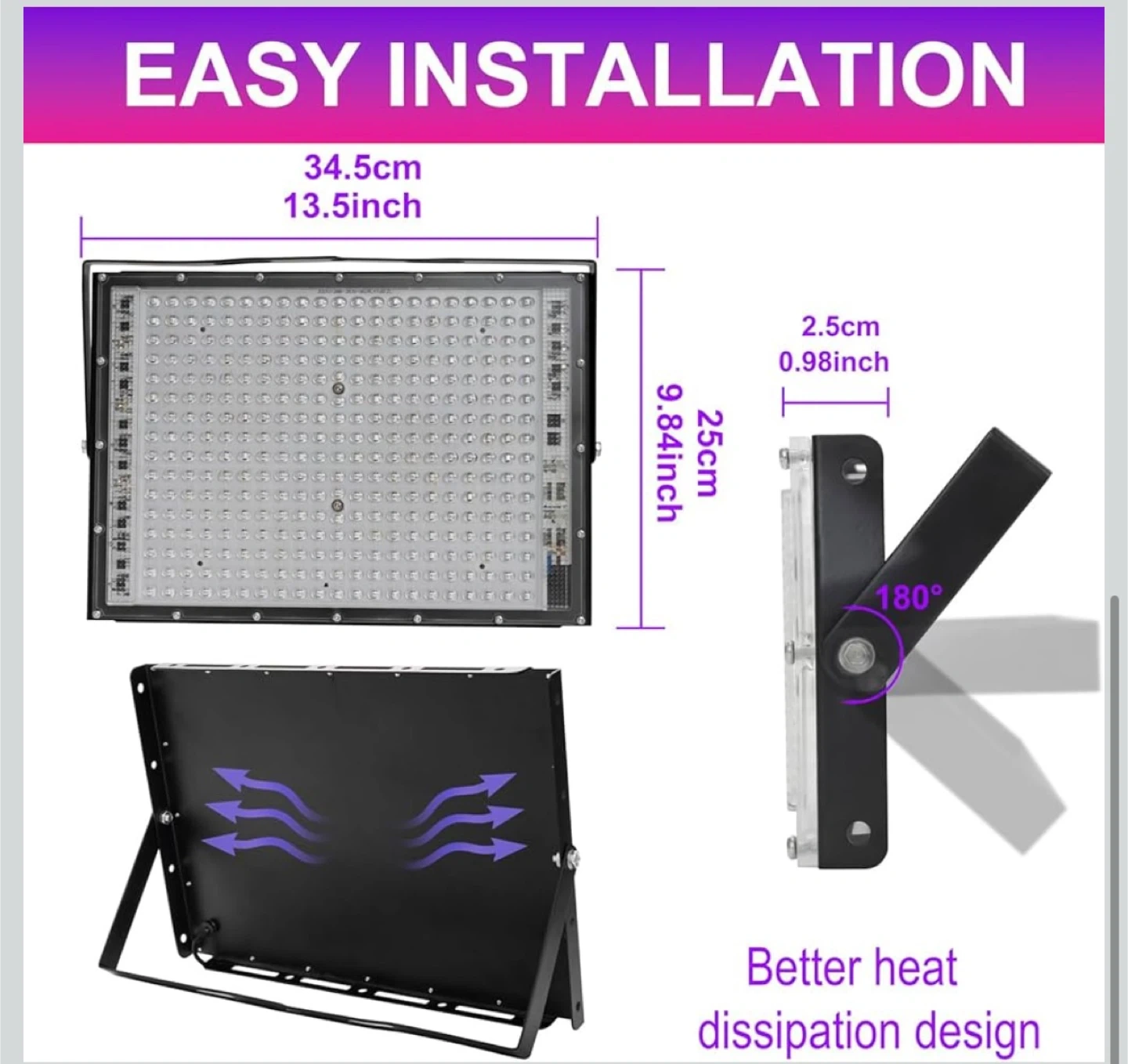 Powerful LED black light flood light with dimensions of 34.5cm x 25cm. It features a wavelength of 395-405nm and has a better heat dissipation design. Suitable for parties, fluorescent reactive displays, and stage lighting.