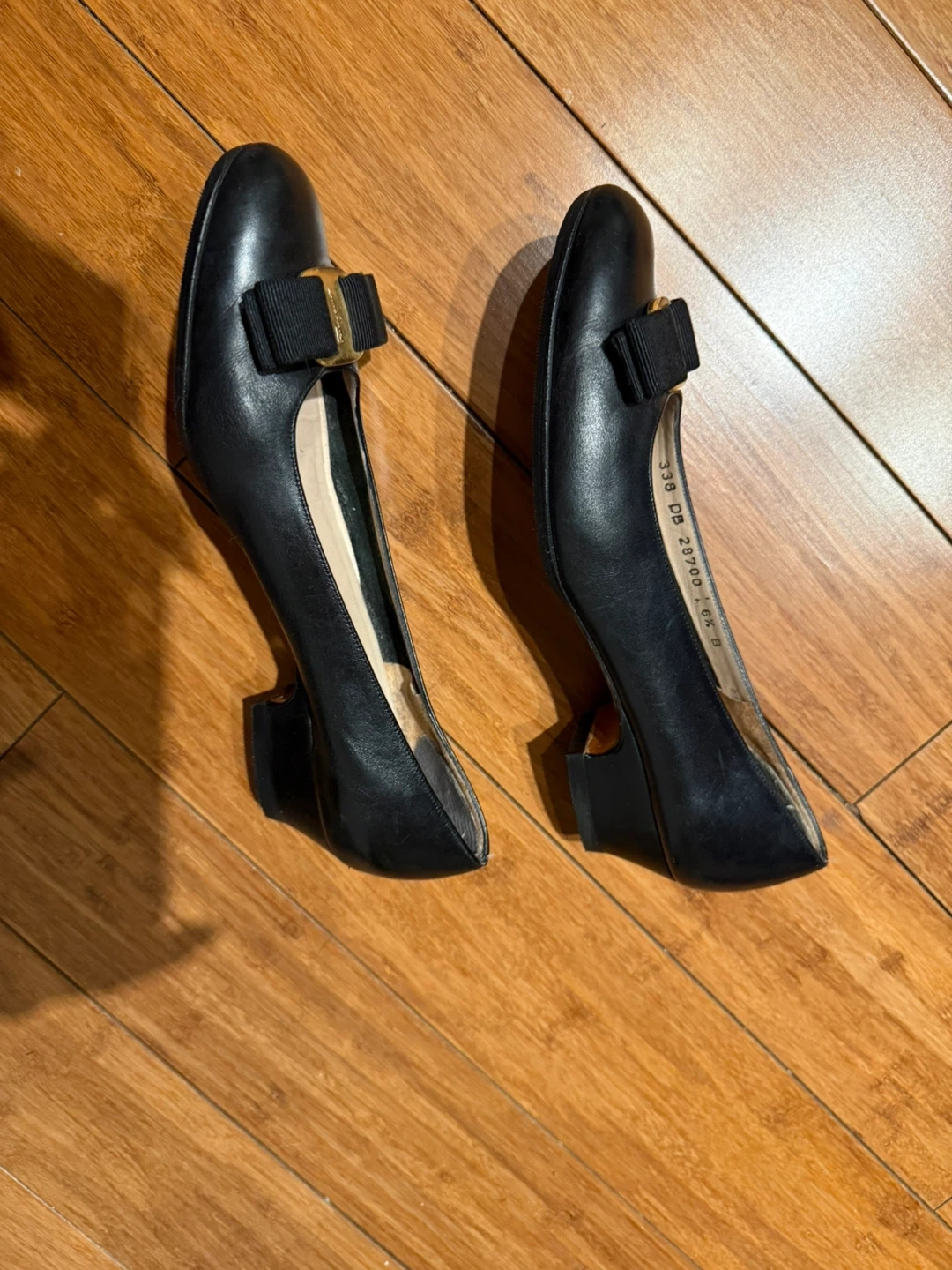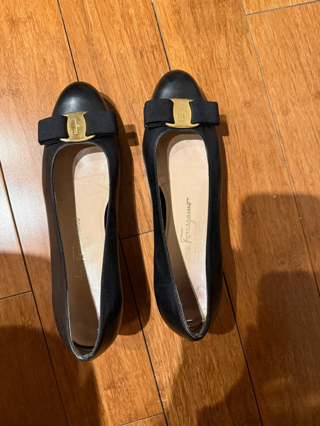 These are classic Salvatore Ferragamo Vara bow pumps in black leather. The iconic Vara bow with gold hardware adds a touch of elegance. These pumps are made of leather with a comfortable heel height.