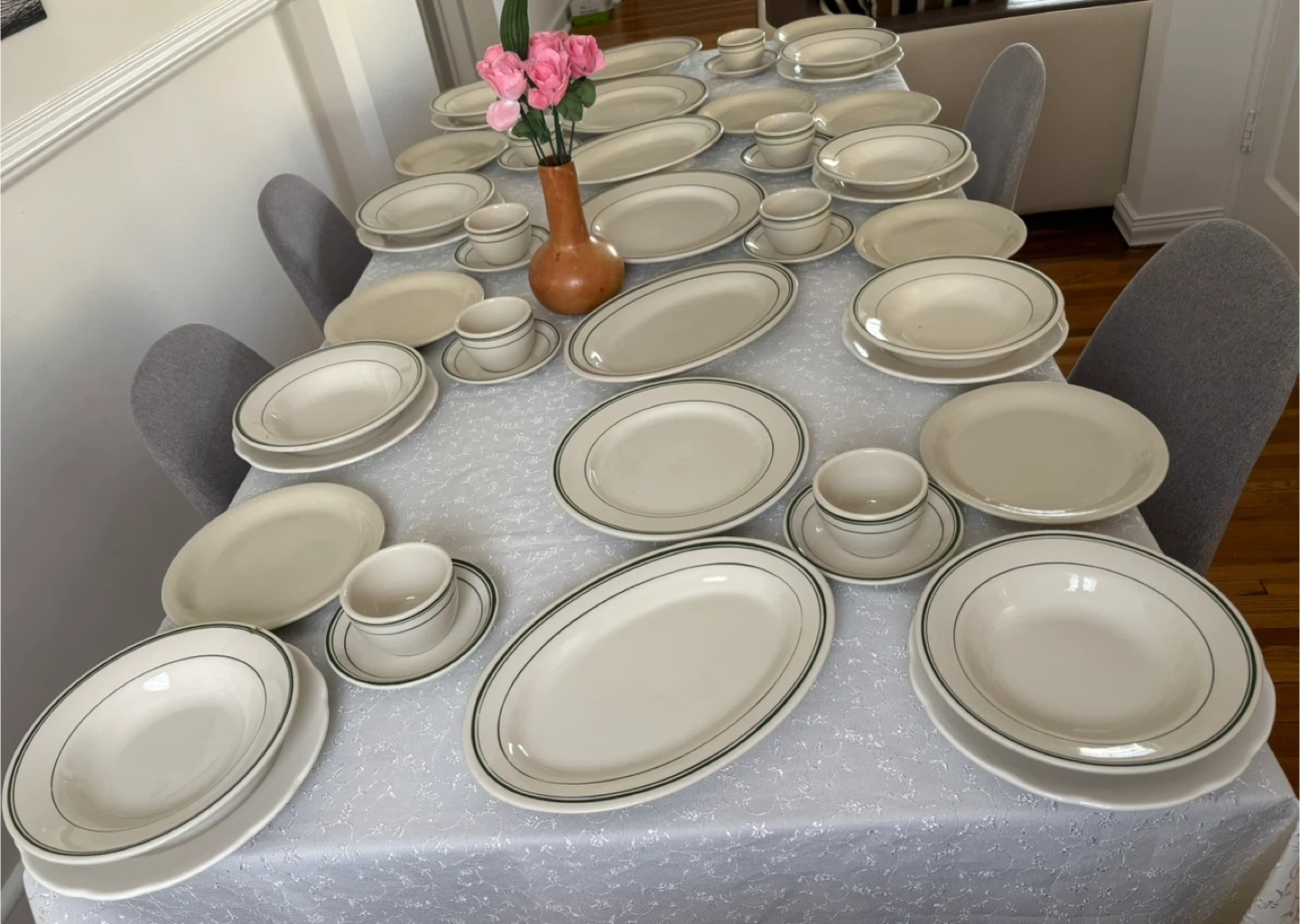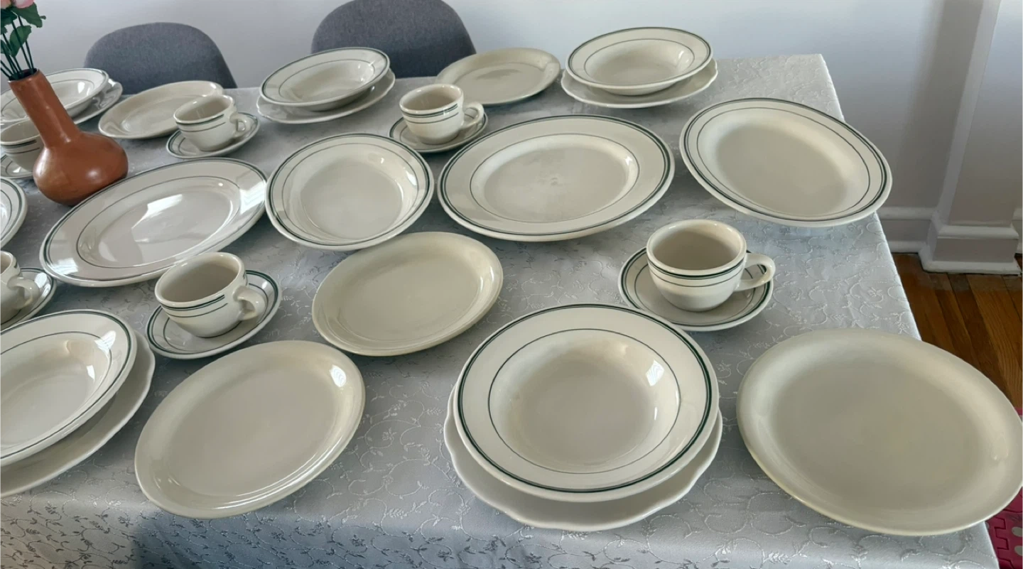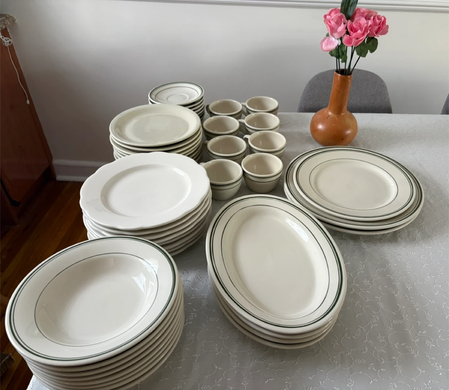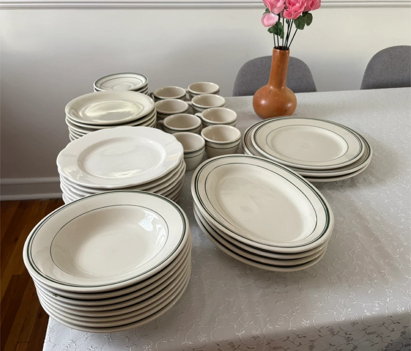 This set includes multiple dinner plates, bowls, and cups with saucers. They all feature a classic cream color with a simple green rim detail. This dinnerware is perfect for hosting guests or for everyday use!