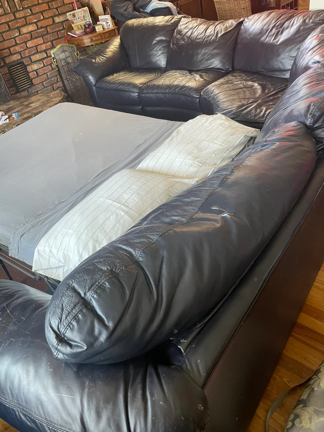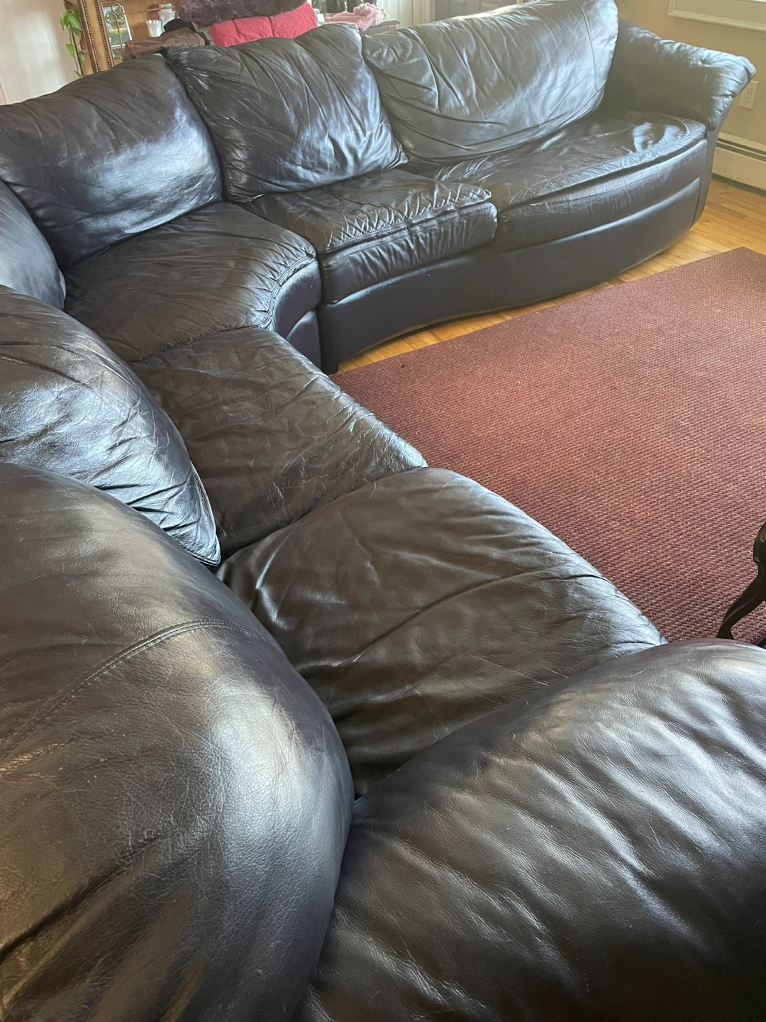 This dark eggplant Natuzzi leather sectional sofa features a pull-out sofa bed. It's in good condition and ready for a new home. Needs 2 or more grand it’s for pick up … negotiable needs to go