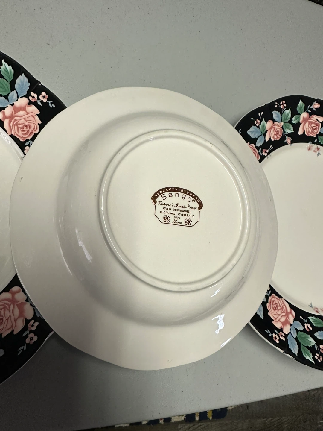 Sango Victoria's Garden dinner plates with a floral rose pattern on a black border. 2 plates and one bowl. Oven, microwave and dishwasher safe. Part of the Victoria's Garden collection.