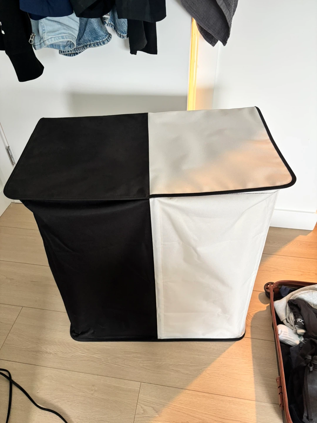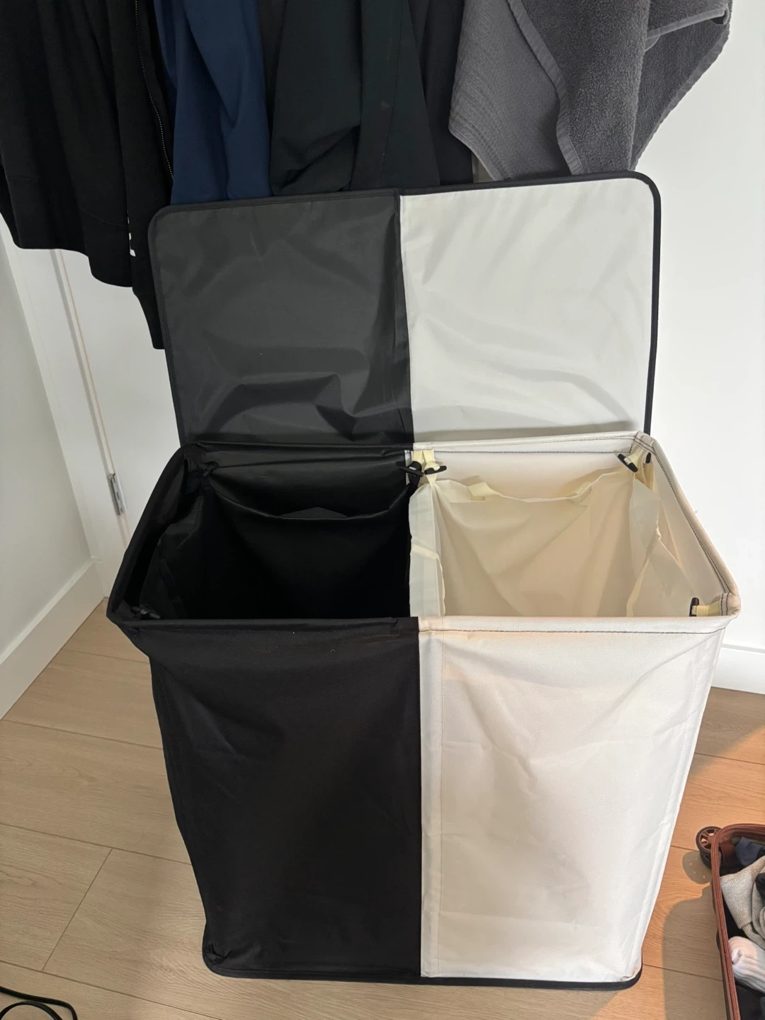 This laundry hamper features two separate compartments for sorting clothes. It's made of fabric and has a lid. This hamper is great for organizing laundry.