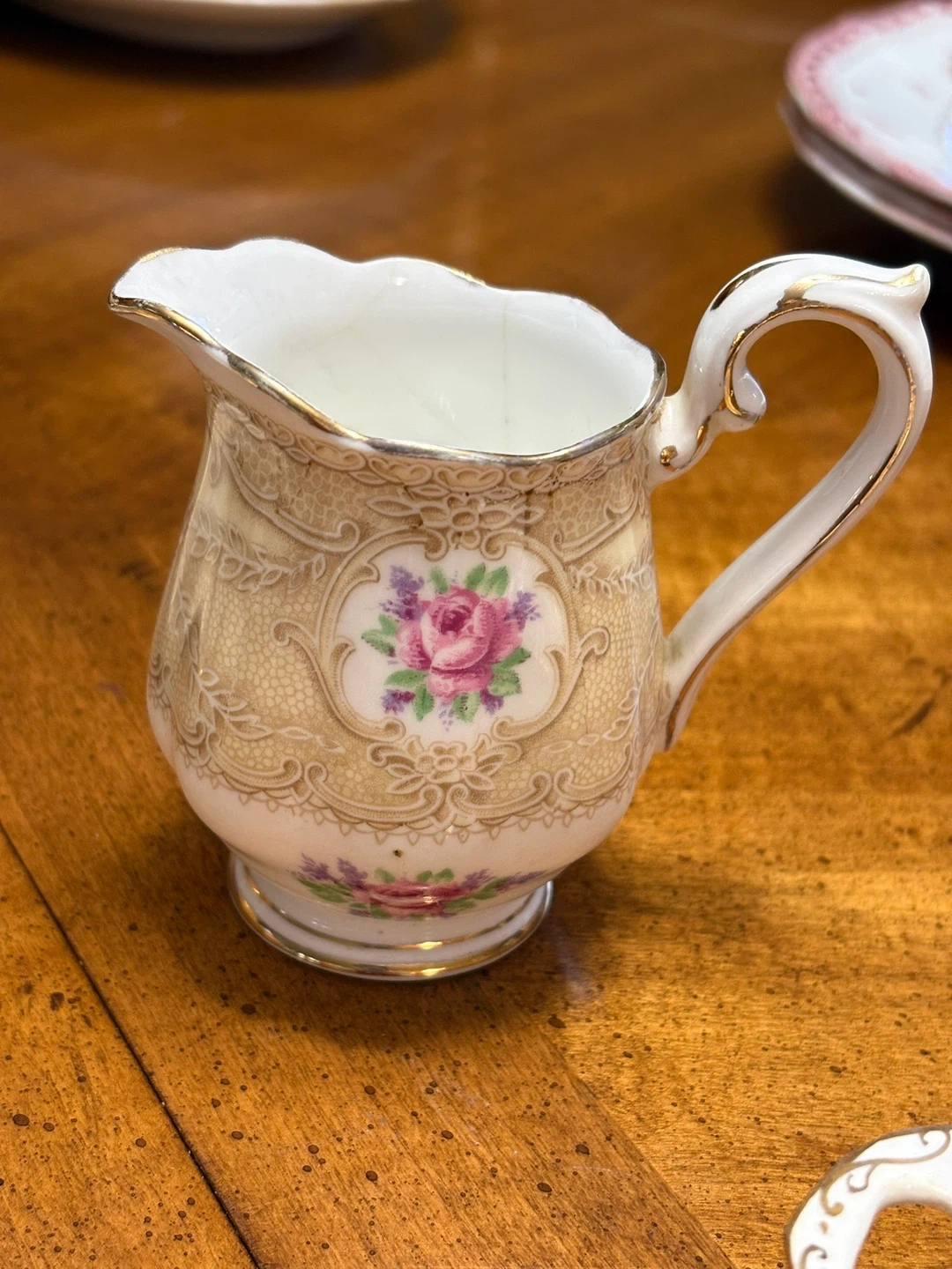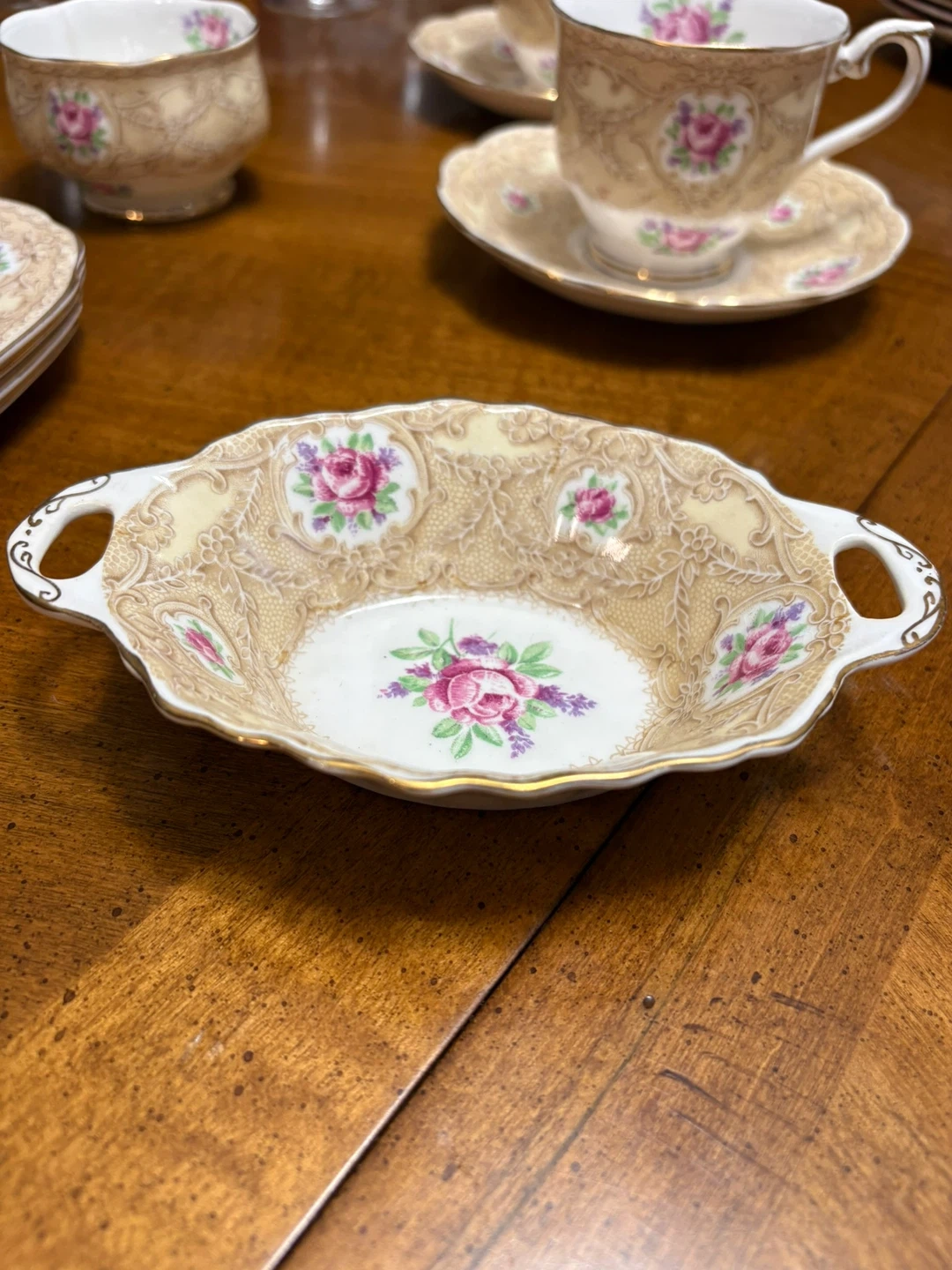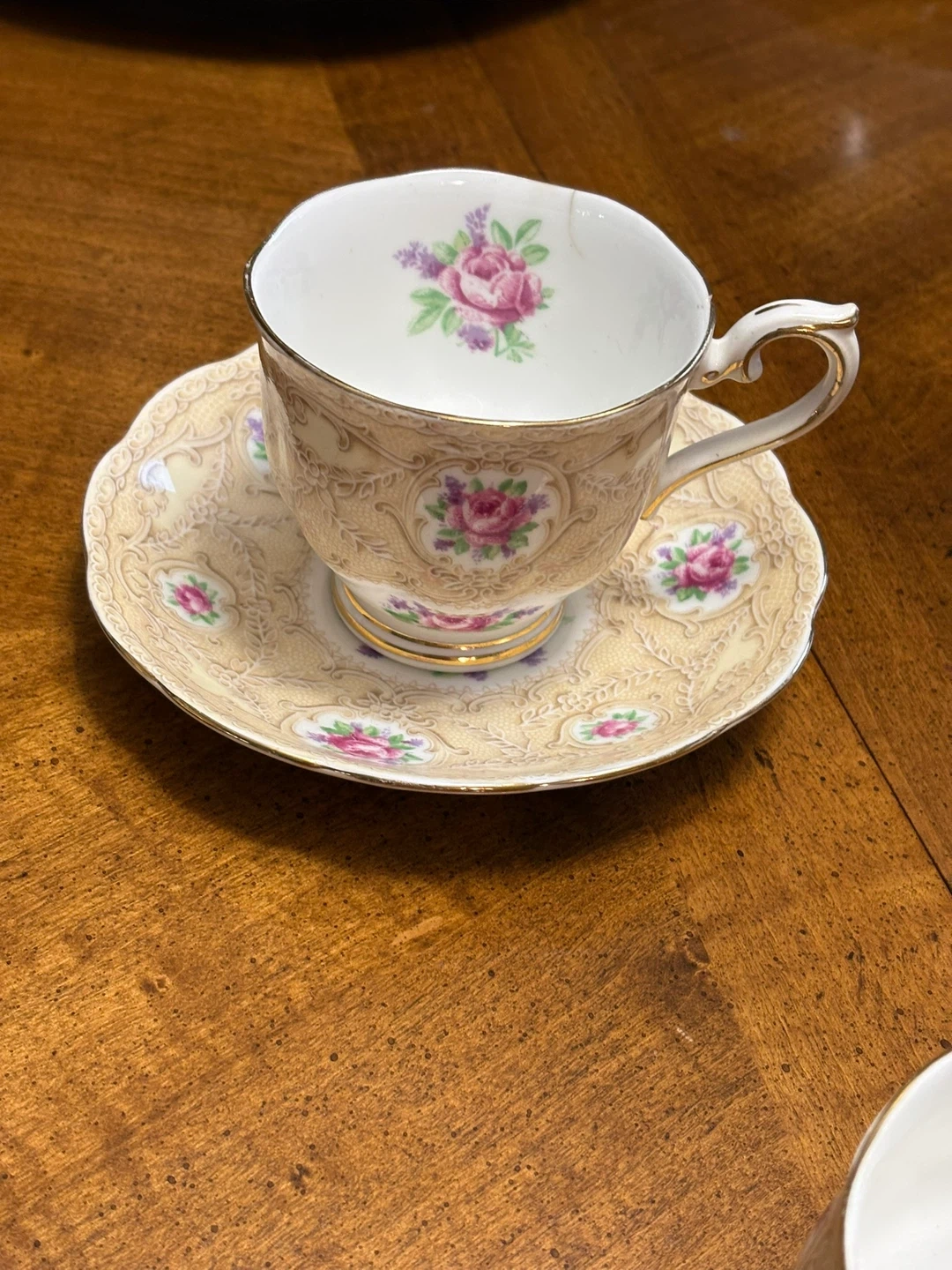 Royal Albert's Devonshire Rose collection. It's made of fine china and features a lovely floral pattern with gold trim.