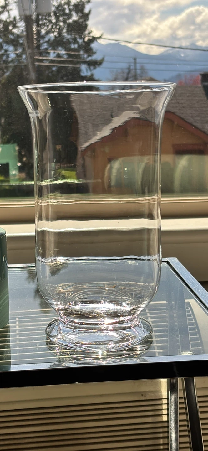 4 Clear glass vase with a flared top and a pedestal base. It's made of glass and suitable for flowers or as a decorative piece.