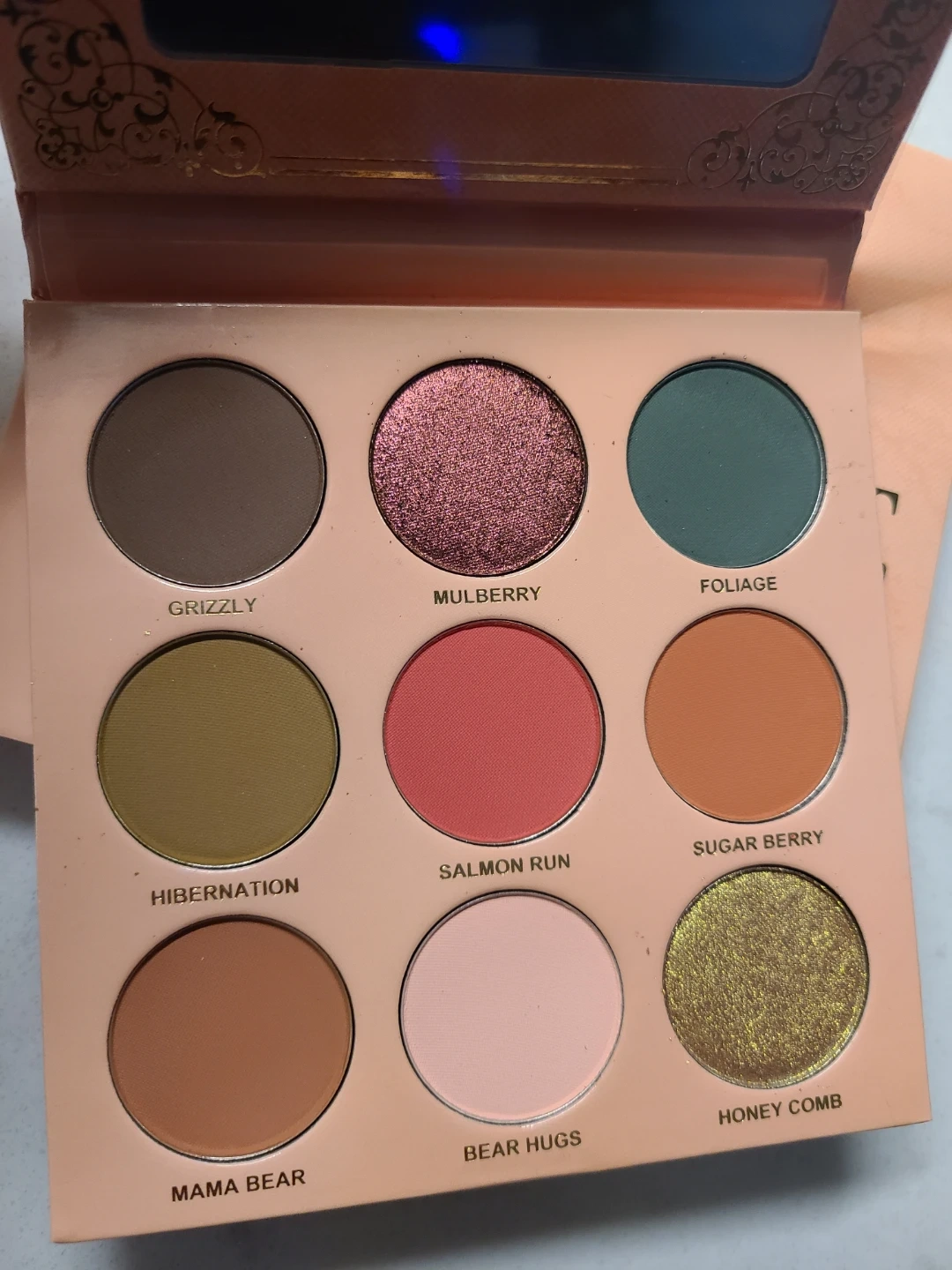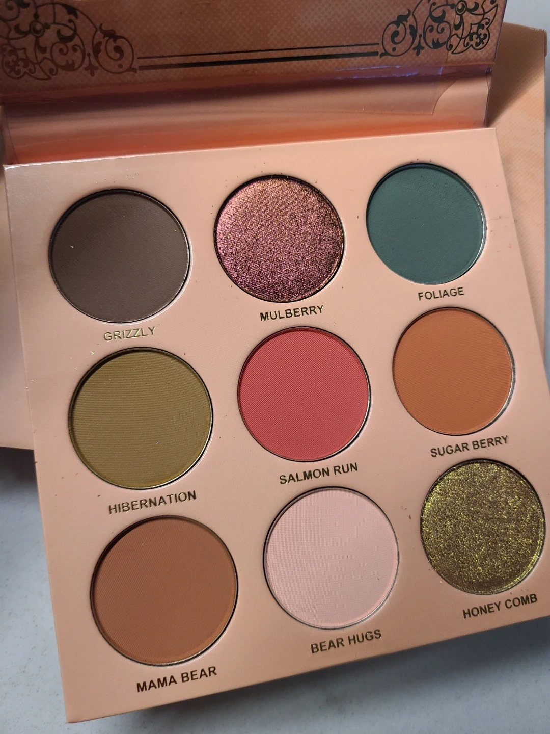Menagerie Arthurine eyeshadow palette. Features nine shades including Grizzly, Mulberry, Foliage, Hibernation, Salmon Run, Sugar Berry, Mama Bear, Bear Hugs, and Honey Comb.