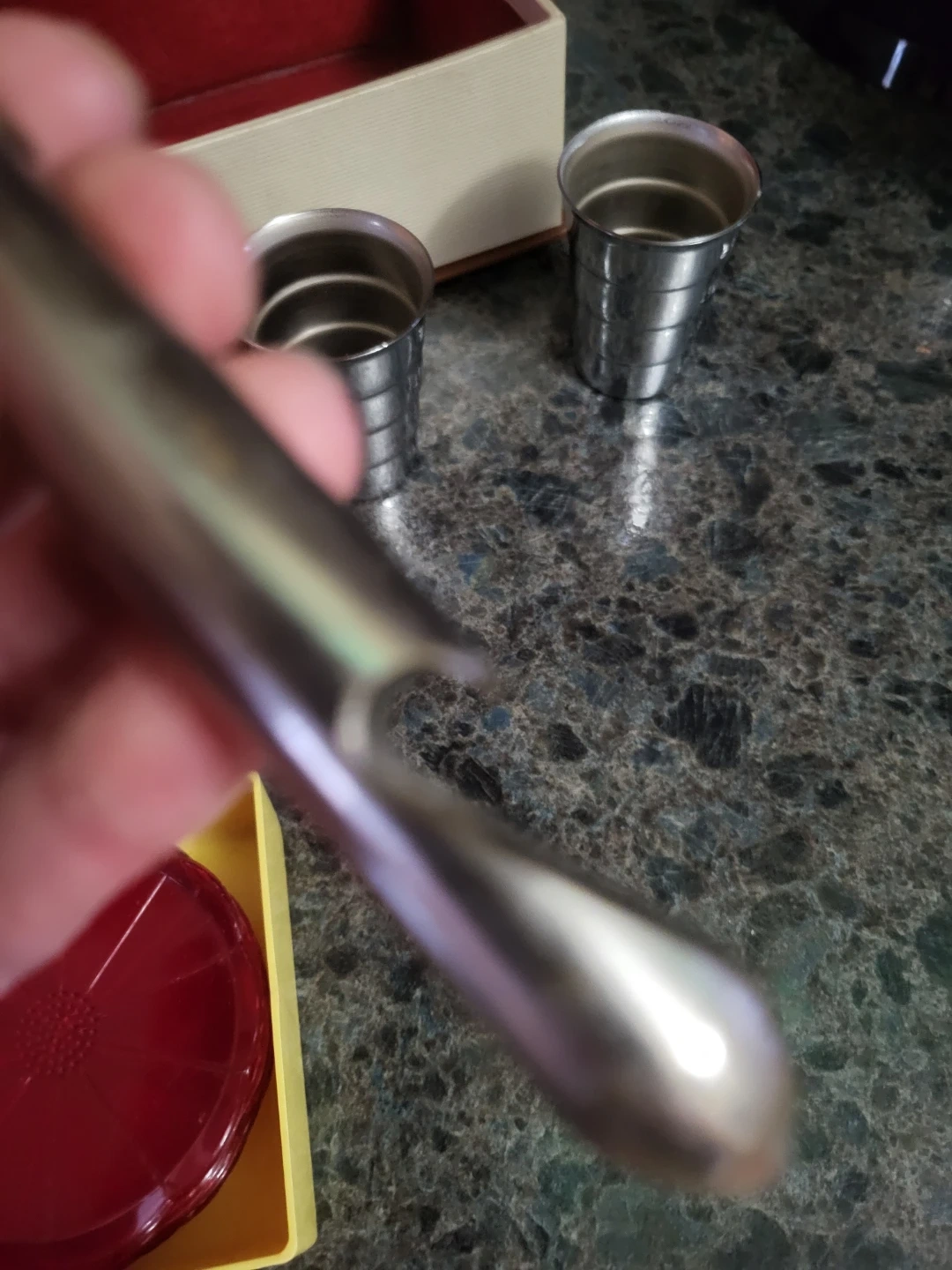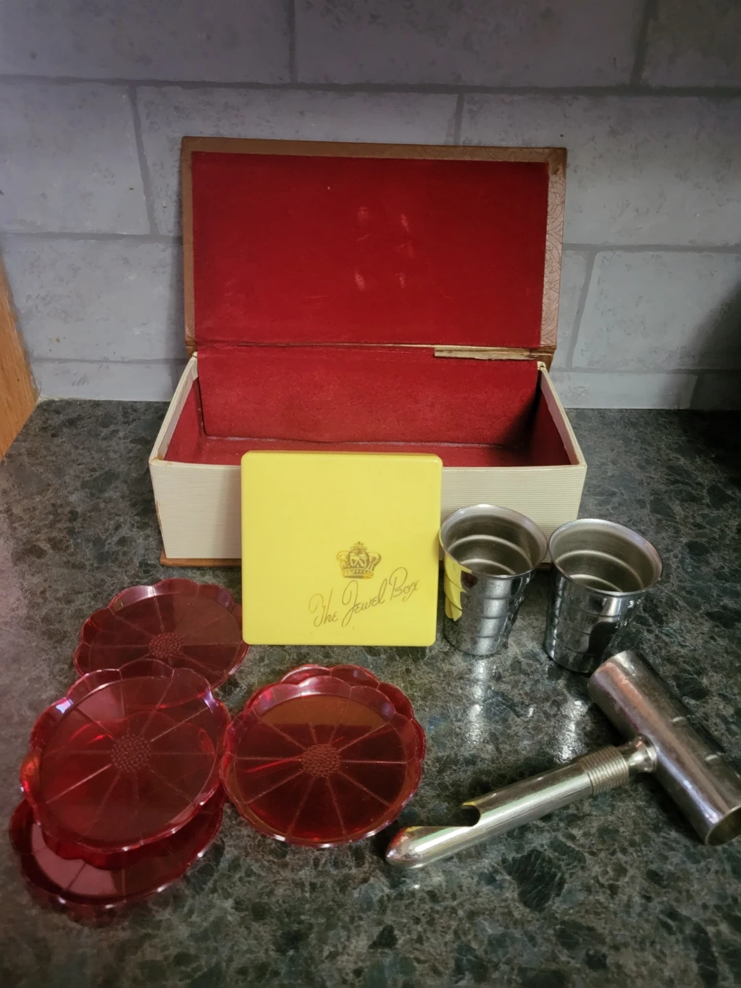 This vintage bar set includes a set of four red coasters and a metal jigger with ounce markings. It comes in a storage box that's also perfect for display. A corkscrew and two small metal cups are also included.