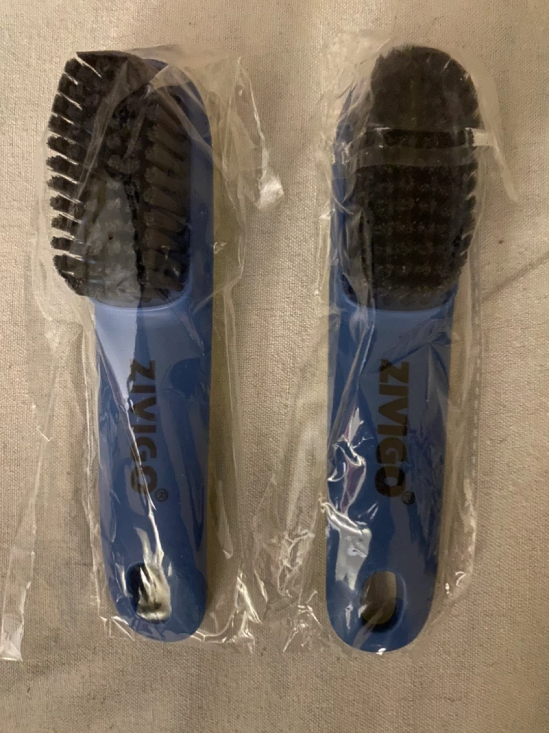 This is a set of two ZINGO shoe cleaning brushes. Each brush has a blue plastic handle and black bristles. They're great for cleaning sneakers and other footwear! The brushes are individually wrapped.