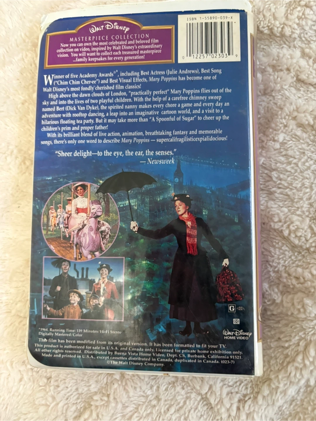 Selling a Walt Disney's Mary Poppins VHS tape from the Masterpiece Collection! It's a classic movie to add to your collection. The tape is in good condition for its age, and the box shows some wear. $8