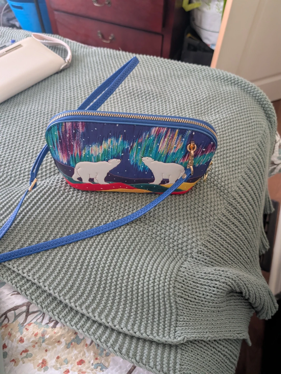 This blue cosmetic bag features a charming design with polar bears gazing at the aurora borealis. It has a zippered closure and a detachable blue strap. Material appears to be faux leather.