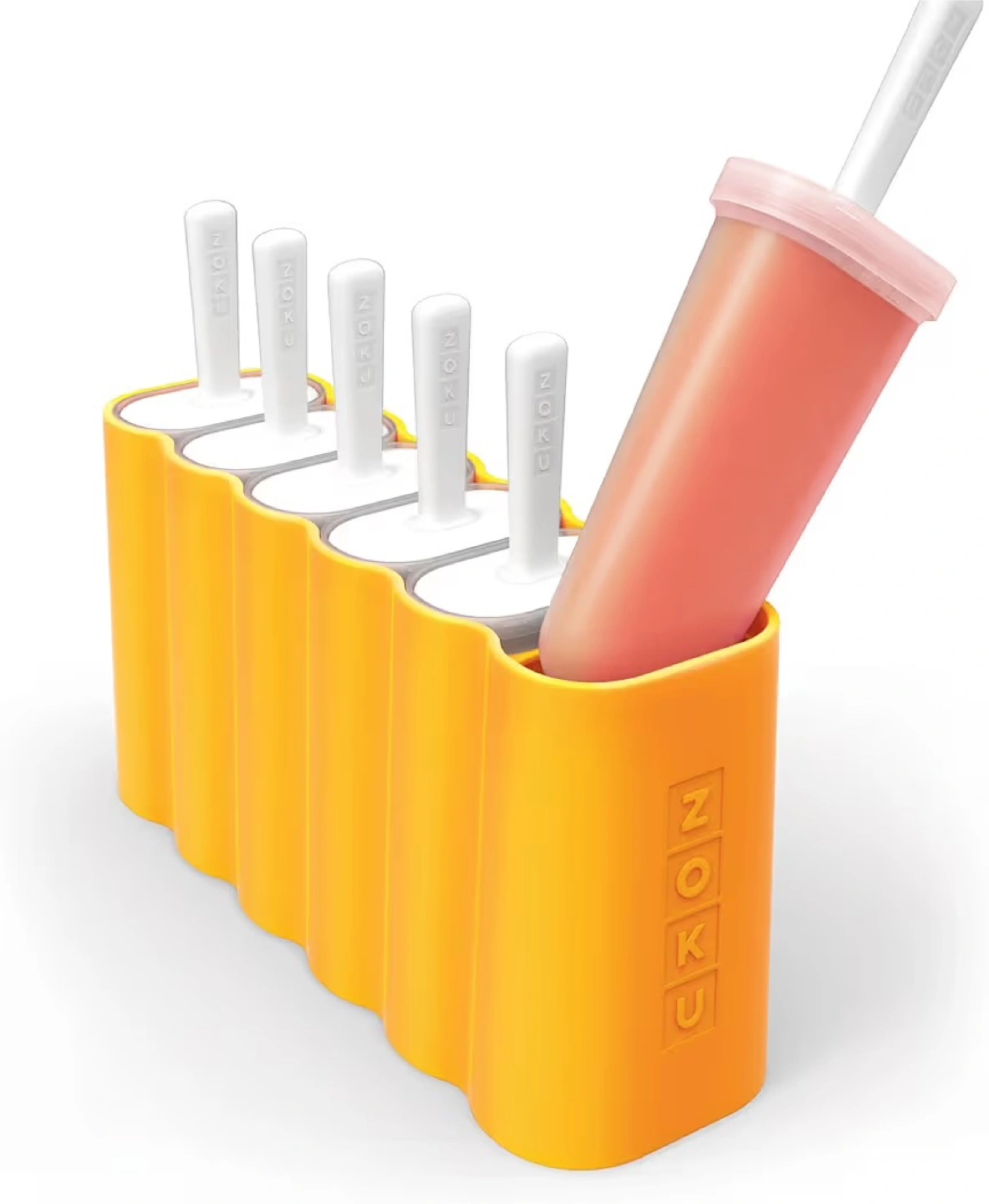A set of pop molds in an eye-catching orange hue. These are perfect for making refreshing treats during the summer. The molds have a sleek design with white handles and a durable base, allowing for easy pop removal.