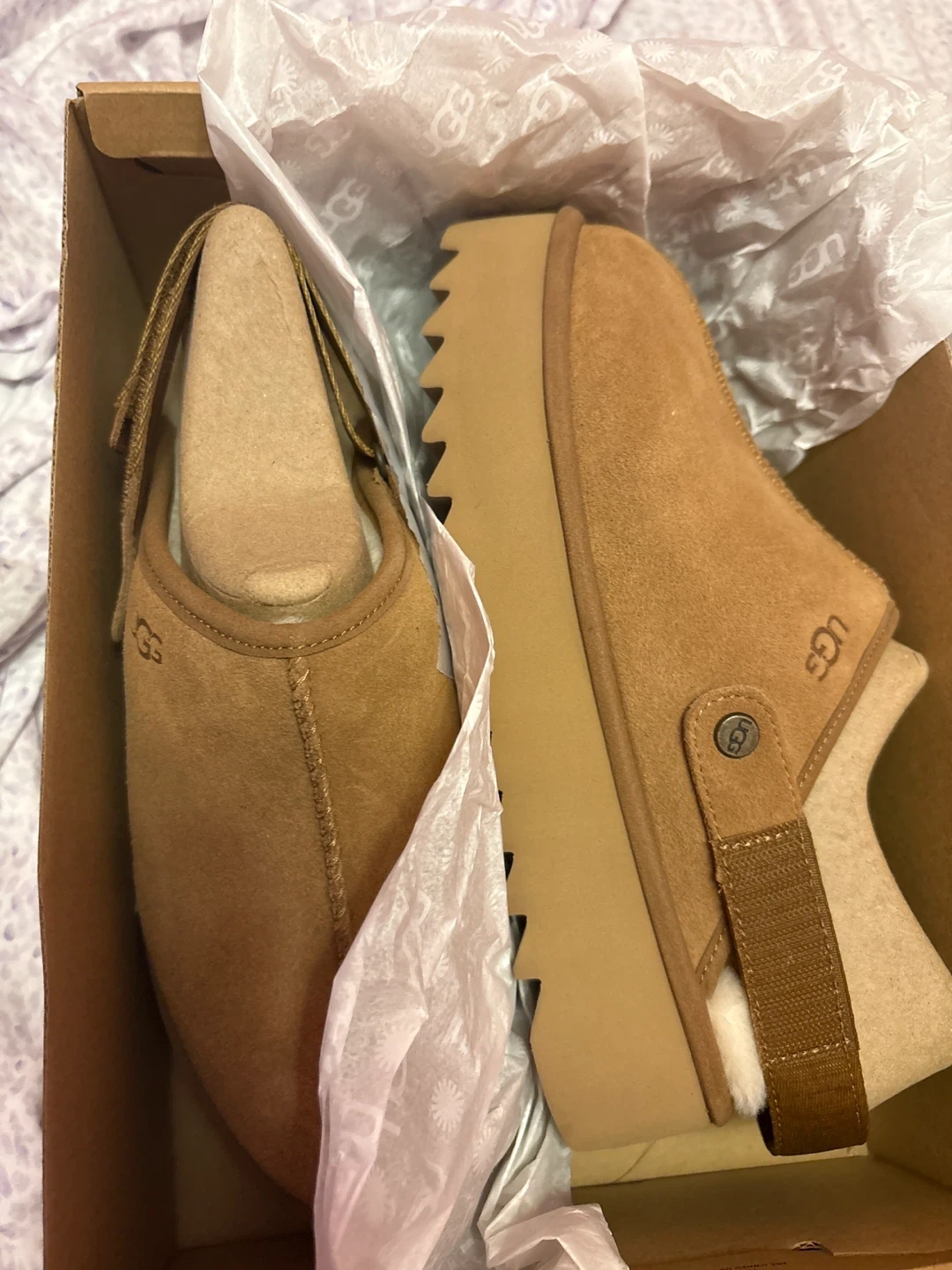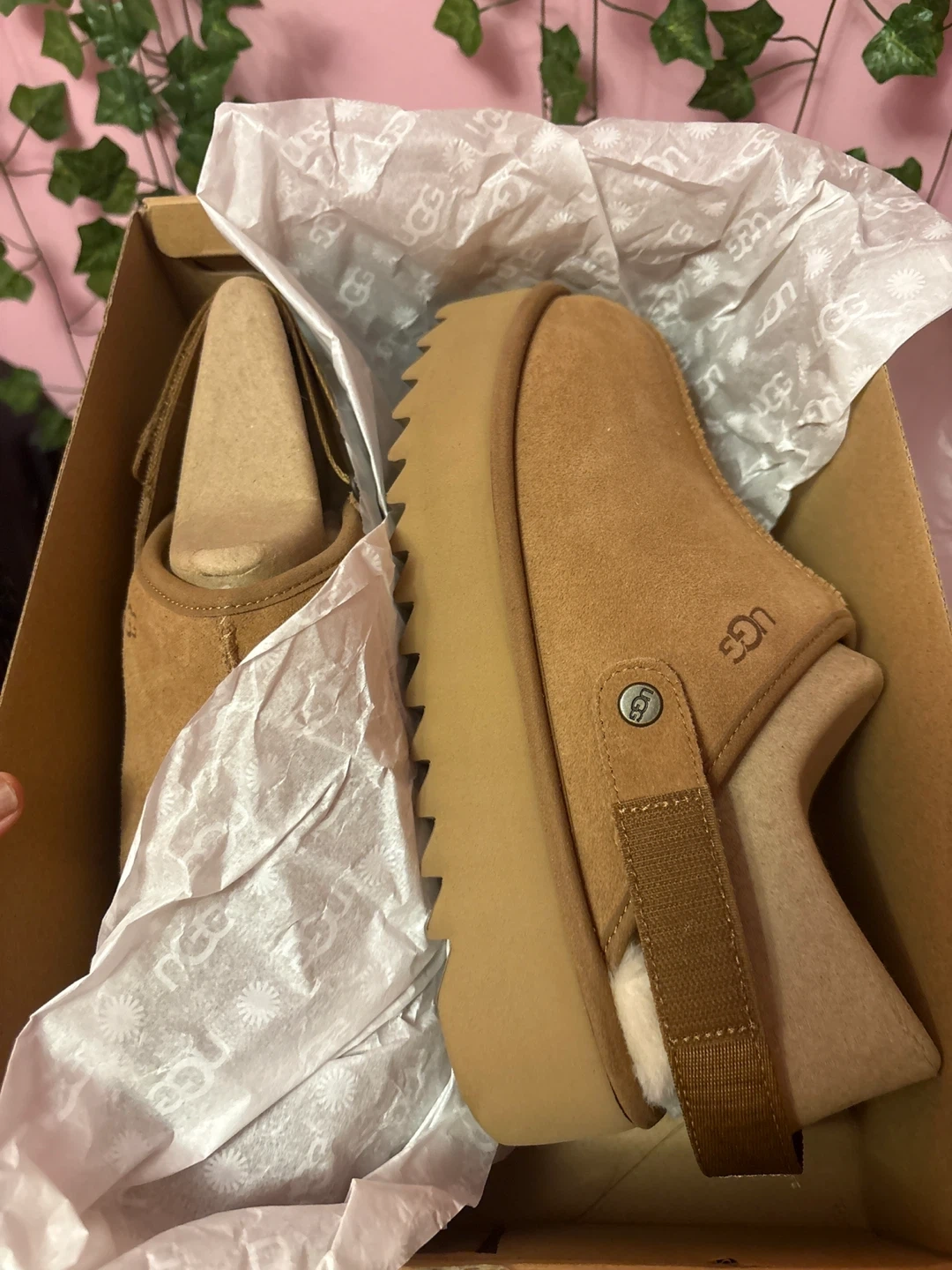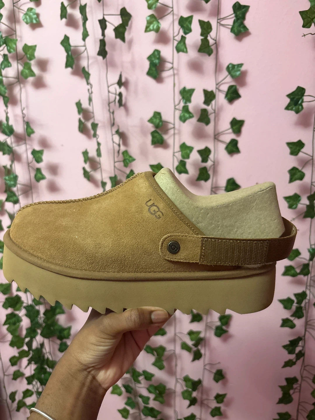 Brand New UGG W Lana Clog Platform shoes are in a size 9 and come in a chestnut colour. They're made with a suede-like material and feature a comfortable platform sole. The original box is included!