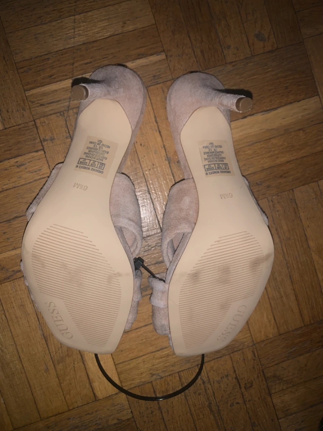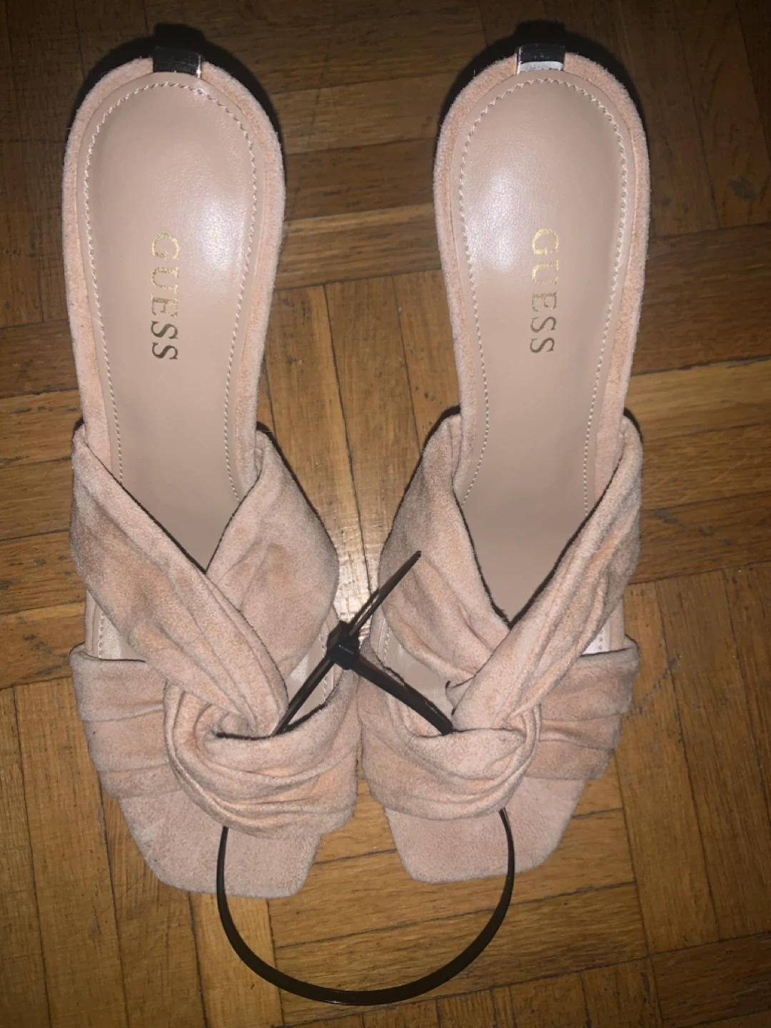 Stylish Guess mules with a knotted twist detail. These open-toe heels feature a comfortable suede material. Heel height appears to be approximately 3-4 inches. Perfect for dressing up or down!