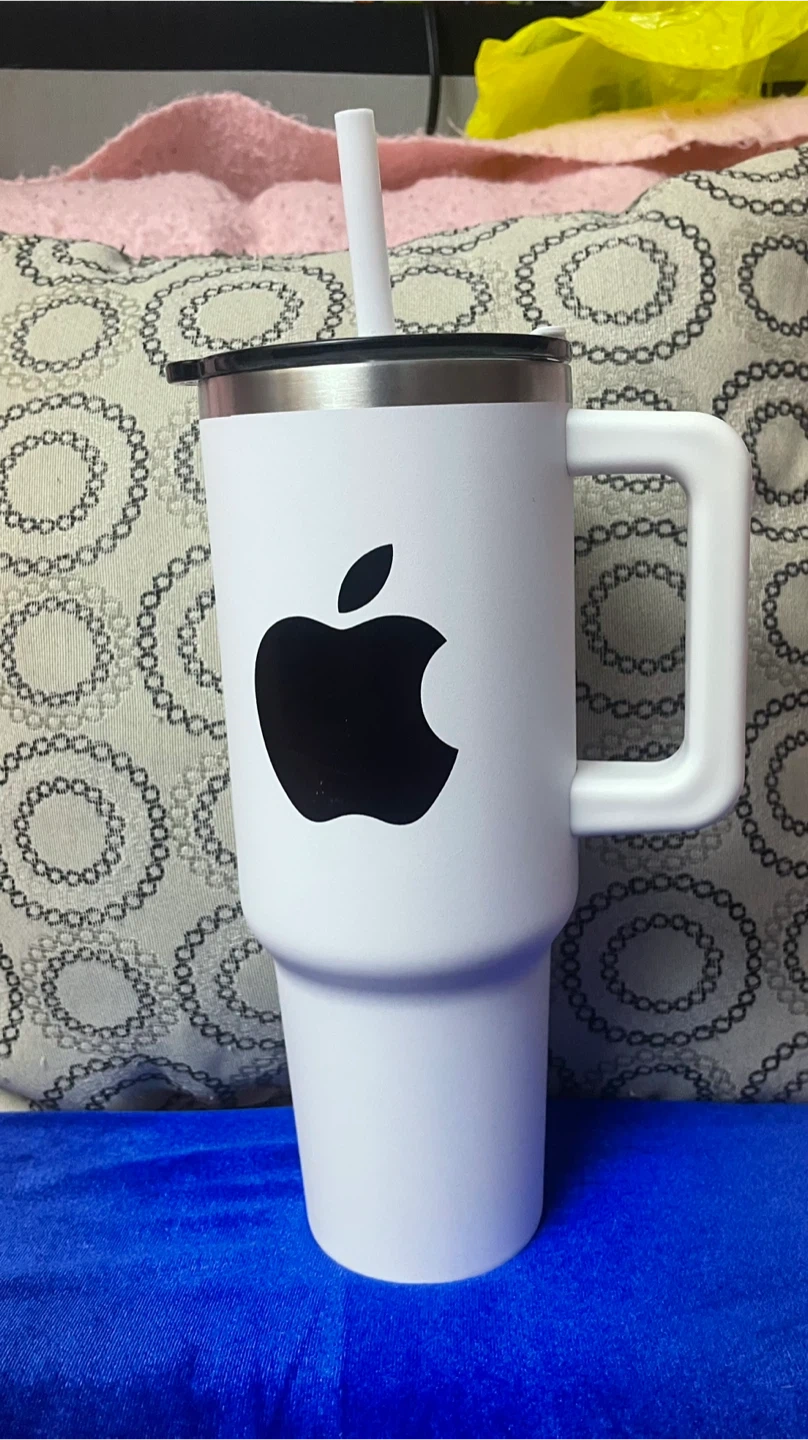 This white tumbler features a large black Apple logo. It comes with a lid and a reusable straw. Stainless steel construction. π₯