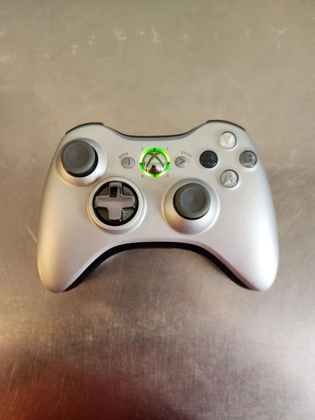 Silver wireless controller for the Xbox 360. It's fully functional and ready for gaming. Works with most Xbox 360 consoles.
