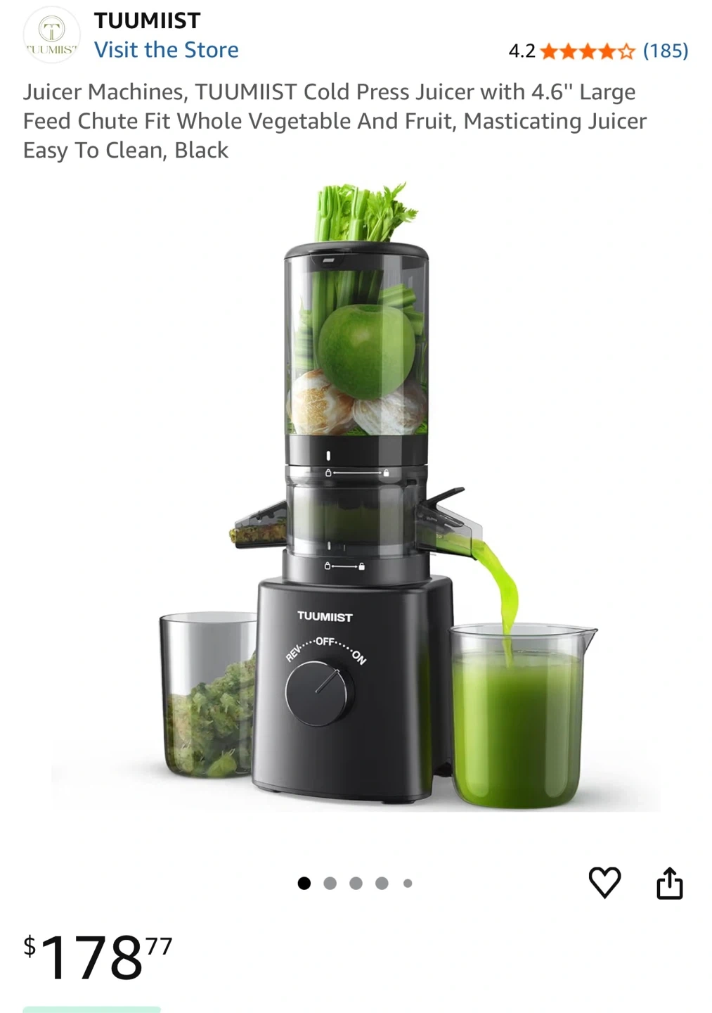 This TUUMIIIST slow juicer is black. It features a 4.6" large feed chute for whole fruits and vegetables. The masticating juicer is easy to clean.