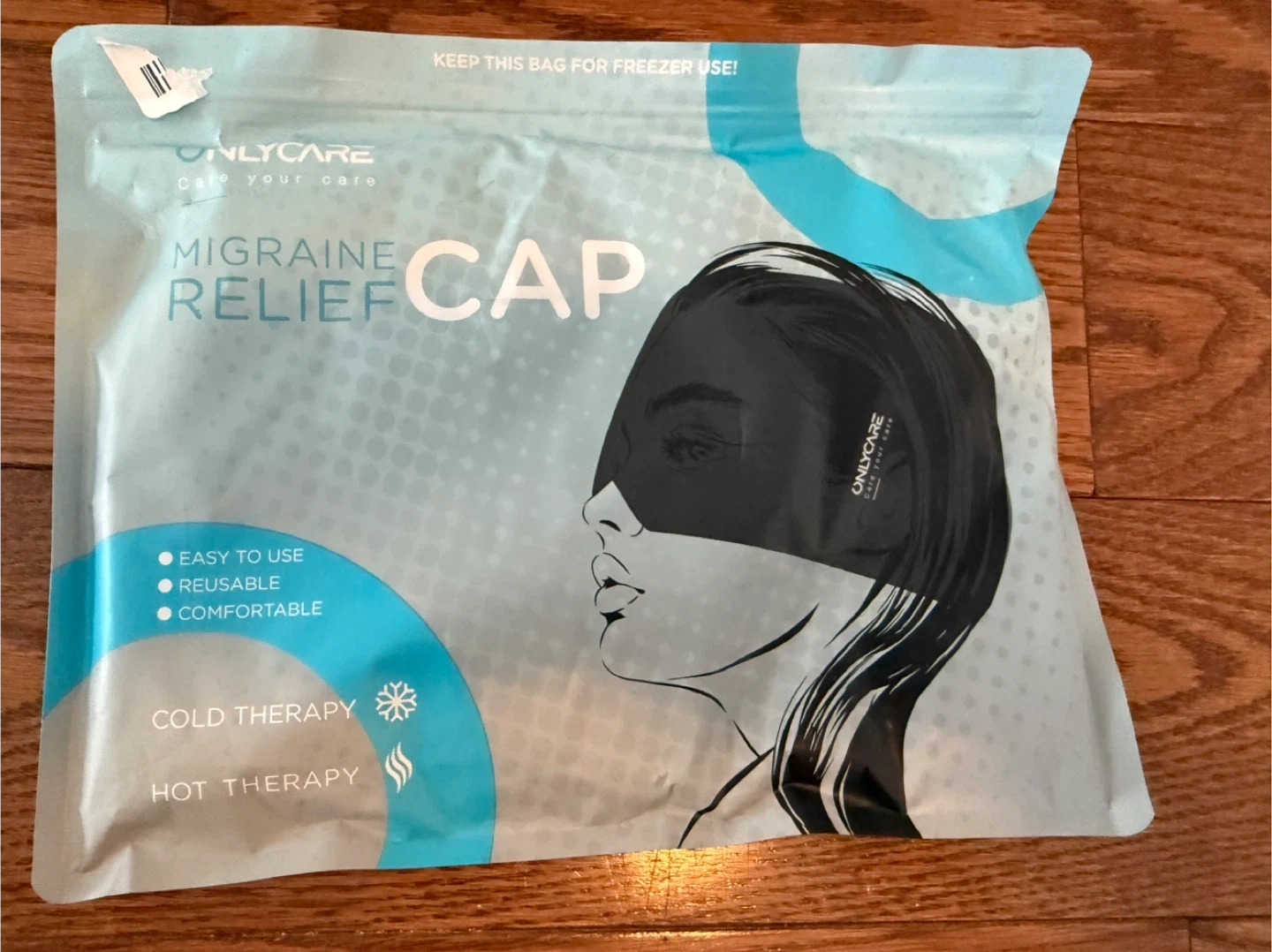 Reusable migraine relief cap that provides soothing cold or warm compression for headaches, sinus pressure, or stress relief.