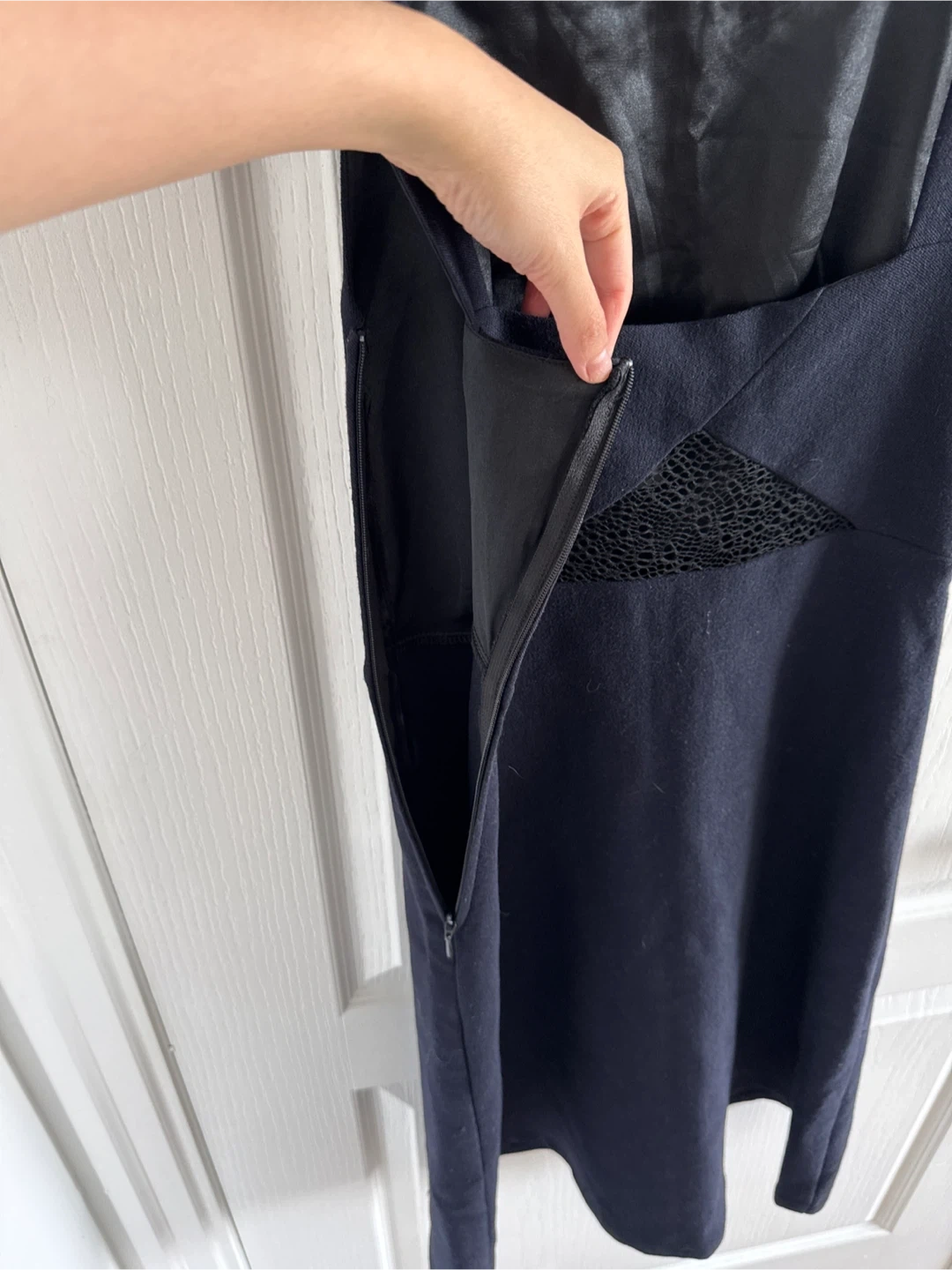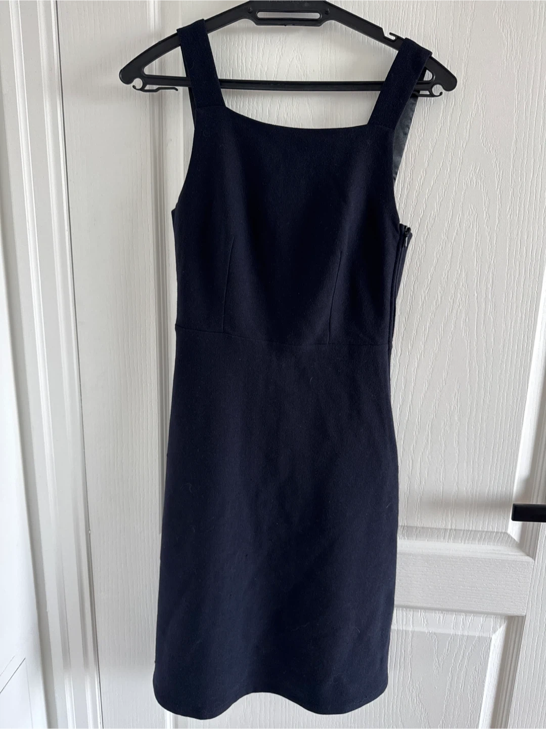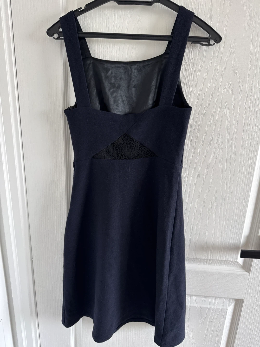 This navy blue dress features a square neckline and adjustable straps. It includes lace panel detailing on the back for a stylish touch. Side zipper closure. Material is a soft blend, great for versatile wear.